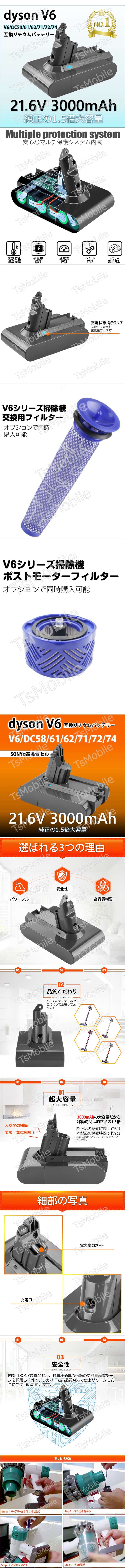 | 確実な3000mAhの大容量 リチウムイオン電池:SONY製セルを採用 過電圧過電流保護回路付き基盤を採用 本商品に対して1ヶ月品質保証有り(人的構造損害、水没、使用回数によるバッテリー劣化と消耗は対象外となります。) 対応機種: V6,SV07,SV09,DC58,DC59,DC61,DC62,DC72,DC74,Dyson V6 Fluffy,Dyson V6 Animalpro,Dyson V6 Motorhead |