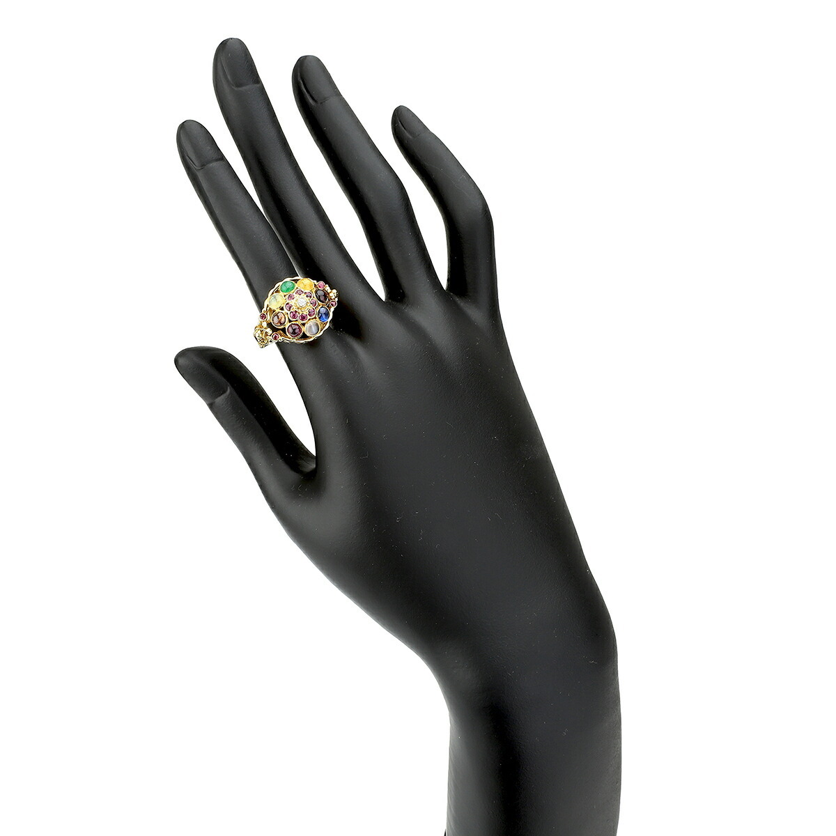 中央のフラワーモチーフをカボションカットの色鮮やかな天然石が円形に囲むエキゾチックなリング。豪華なデザインは、あなたの手元に華やかさを加え、見る人を魅了する事でしょう。