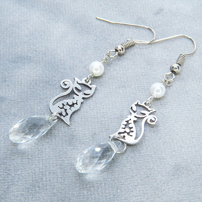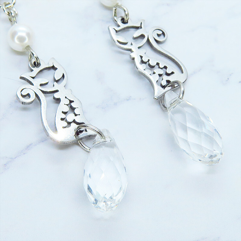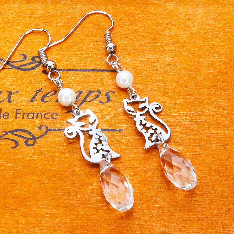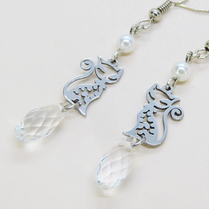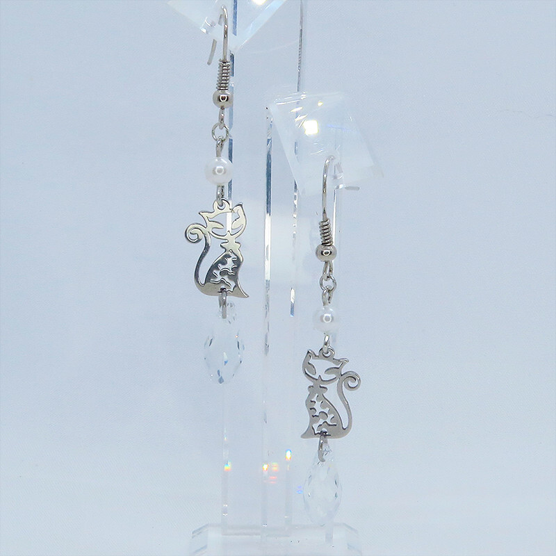 シルバーカラー ステンレス製ダイカット猫モチーフとクリスタルガラスを組み合わせた大人可愛いピアス サージカル可