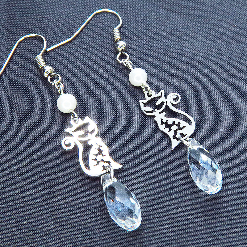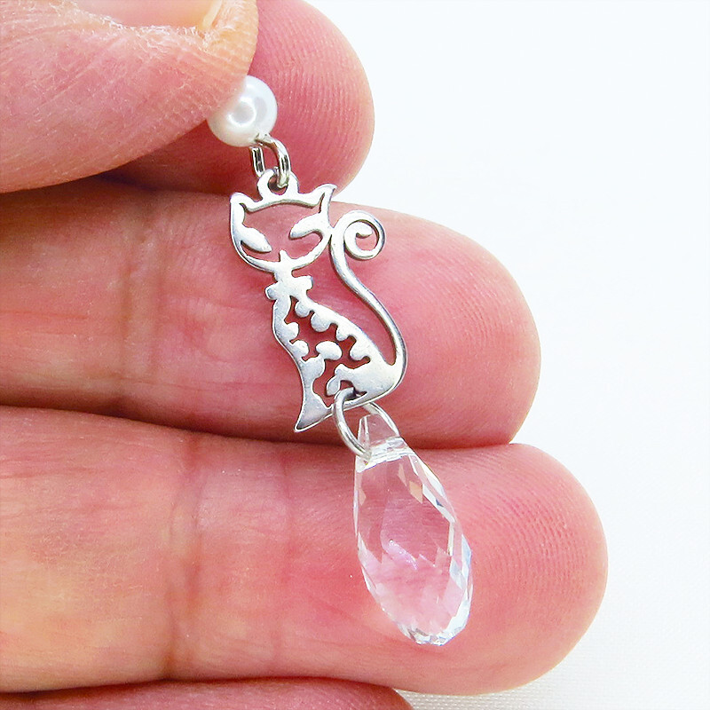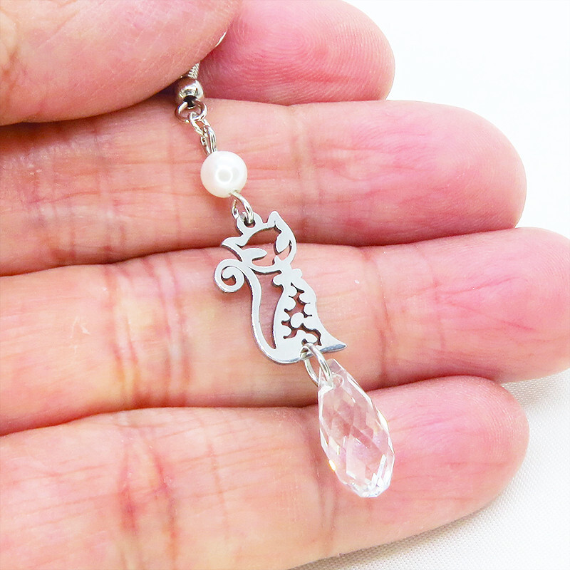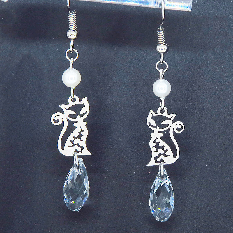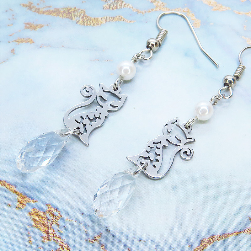 シルバーカラー ステンレス製ダイカット猫モチーフとクリスタルガラスを組み合わせた大人可愛いピアス サージカル可