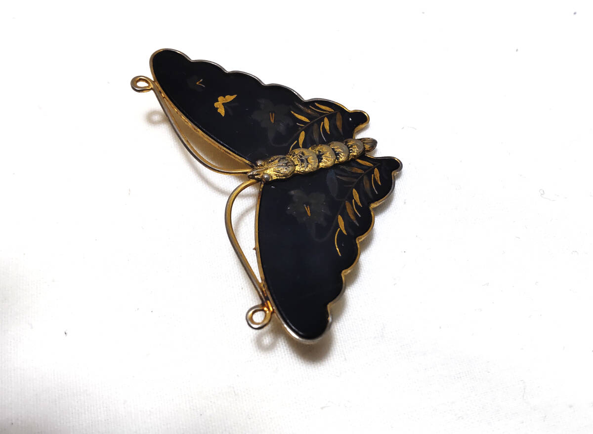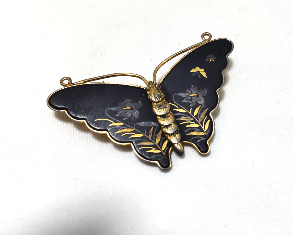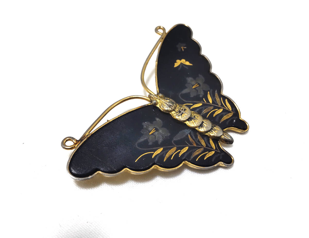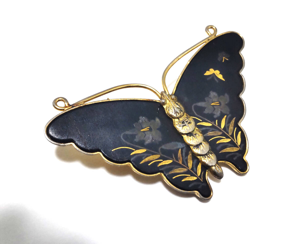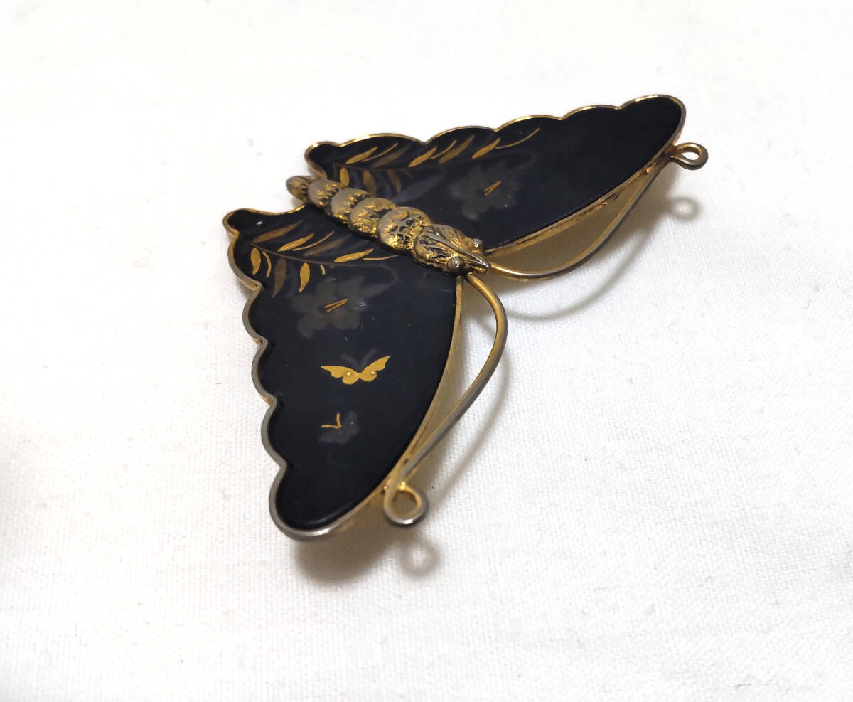 黒胡蝶を象ったアンティークブローチです。翅の上に山百合と小さな蝶が描かれており、存在感のある品です。1950年代頃のものです。