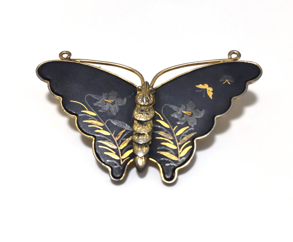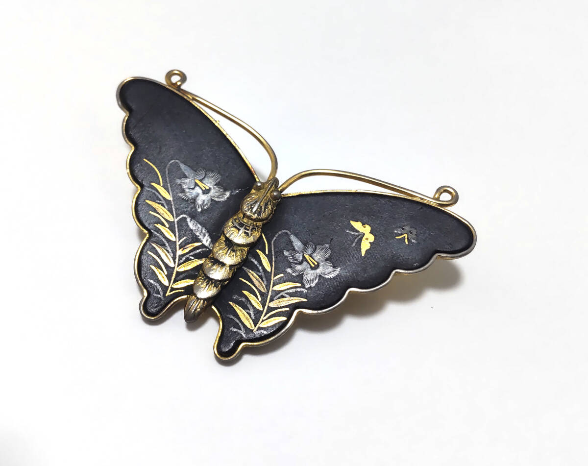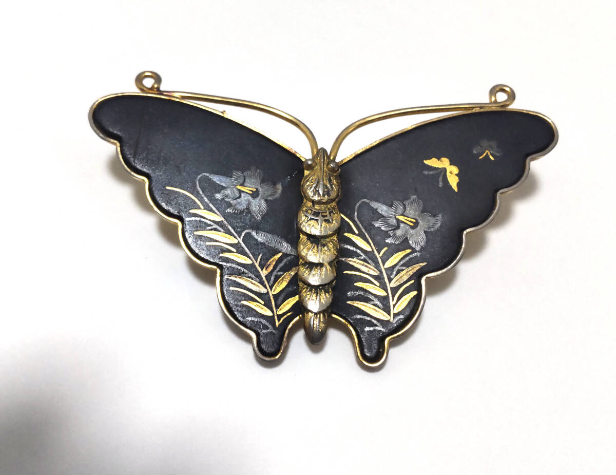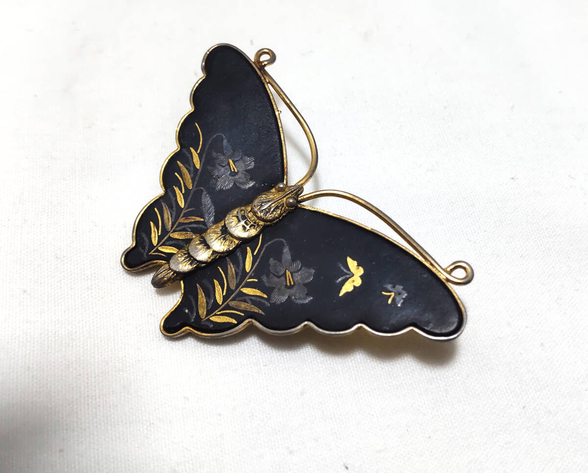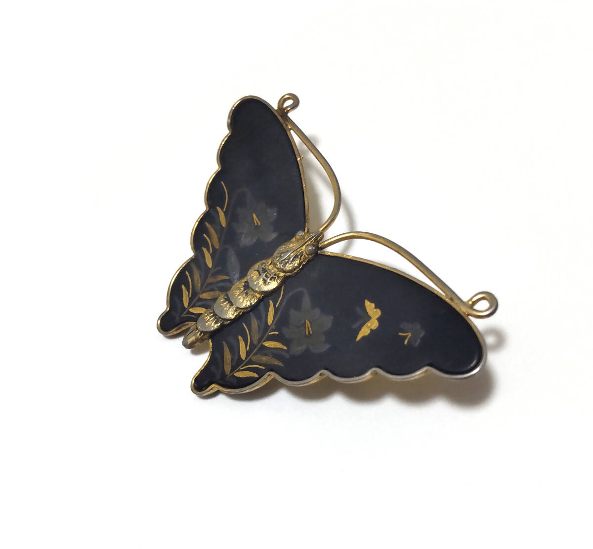 黒胡蝶を象ったアンティークブローチです。翅の上に山百合と小さな蝶が描かれており、存在感のある品です。1950年代頃のものです。