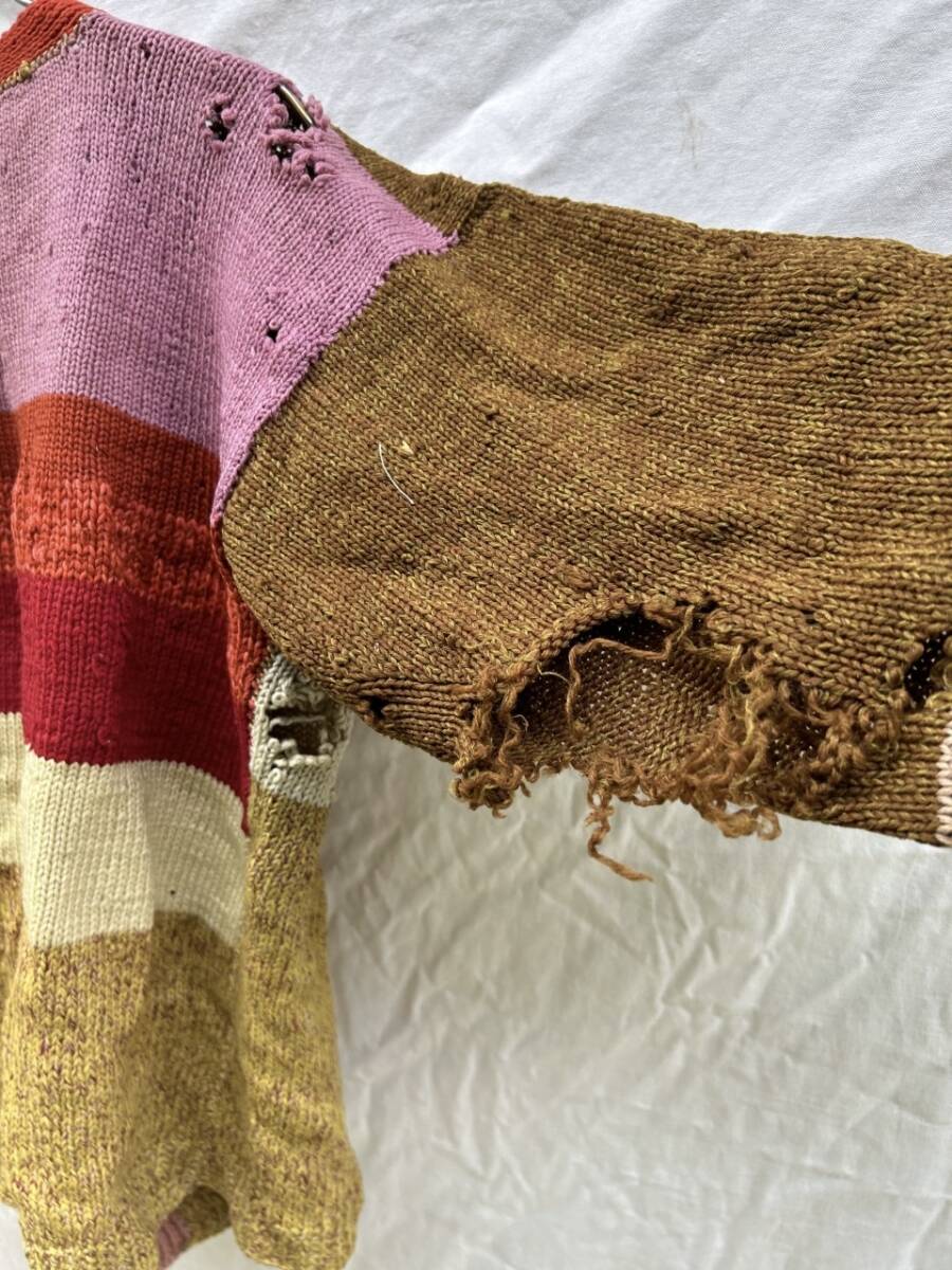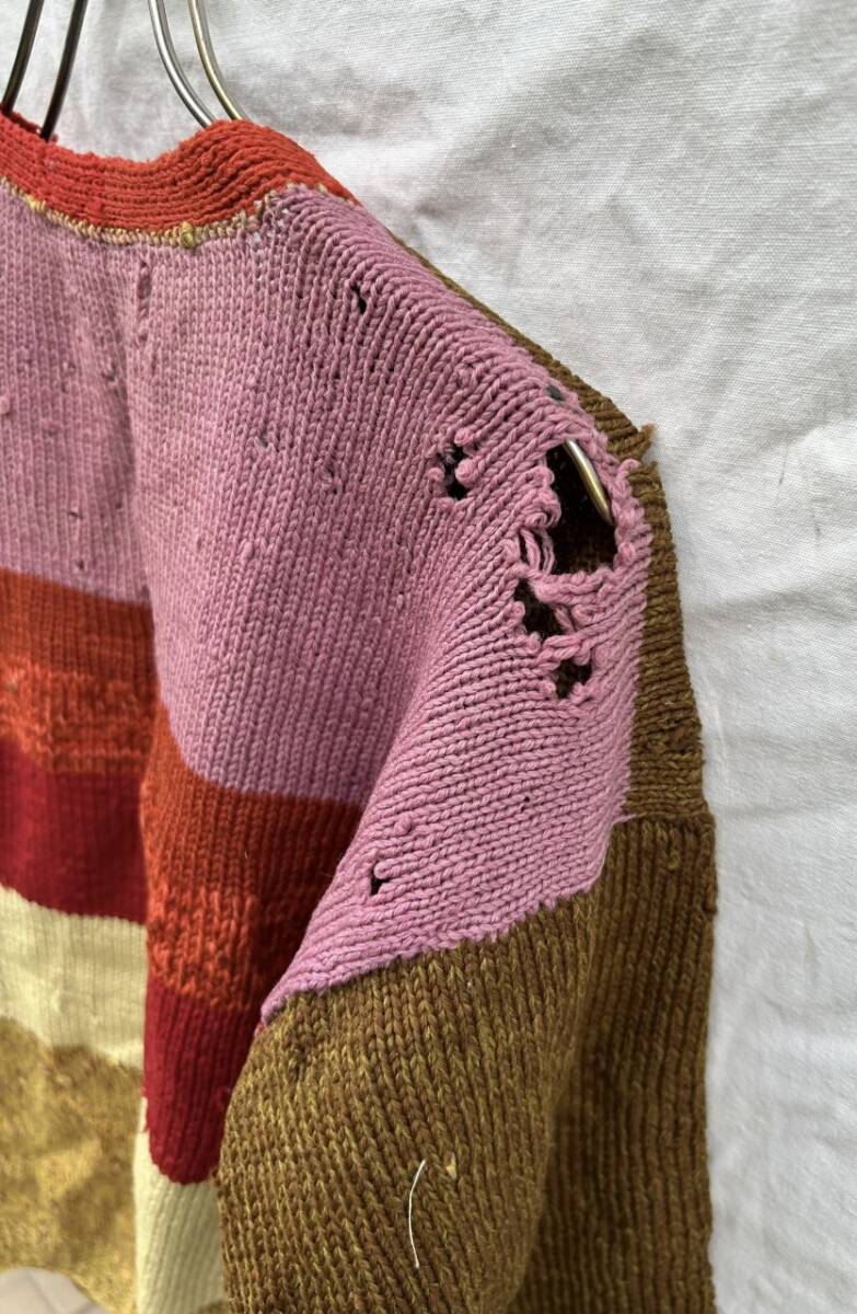 説明:非常に良い色味のニットカーディガン。全体的にほつれや虫食いによって抜群の雰囲気に仕上がっているもの。意図的にではない形でのダメージがいい感じです。このままでも、リメイクでもいいと思います。気になる方はお早めに!!