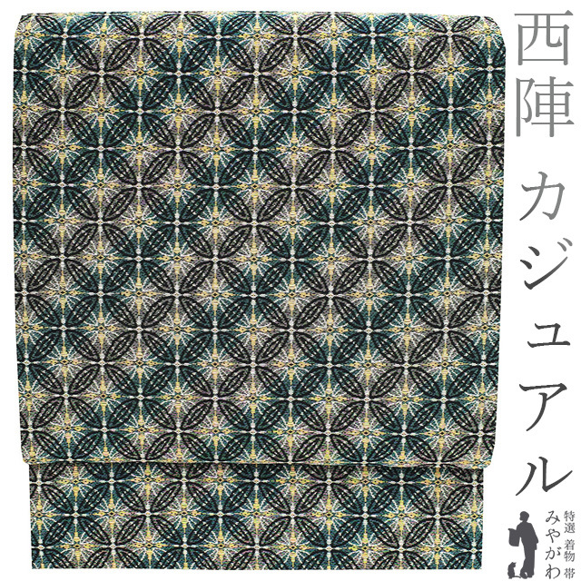 袋帯 京都 西陣 正絹 金糸 銀糸 黒 緑 グレー 花七宝文様 上質な帯地 お洒落なお色合い カジュアル 新古品 仕立て上がり みやがわ sb52622