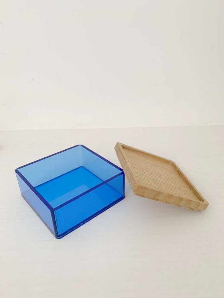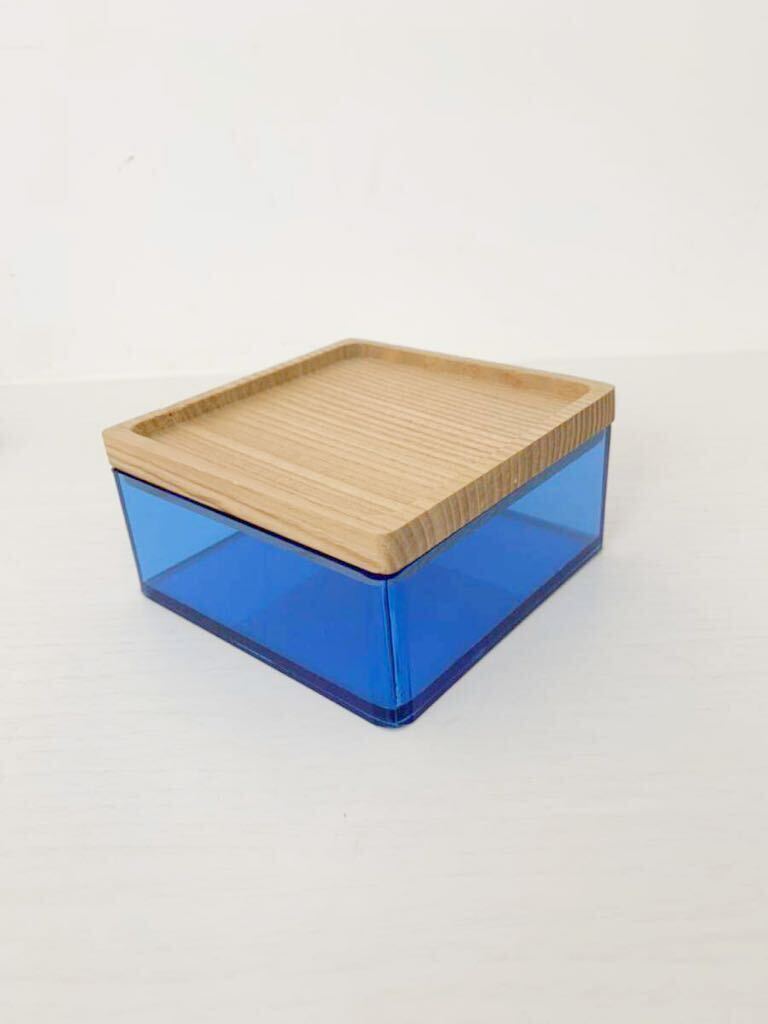 木製の蓋と透き通ったブルーのケースのコントラストがモダンなボックスのご紹介です。