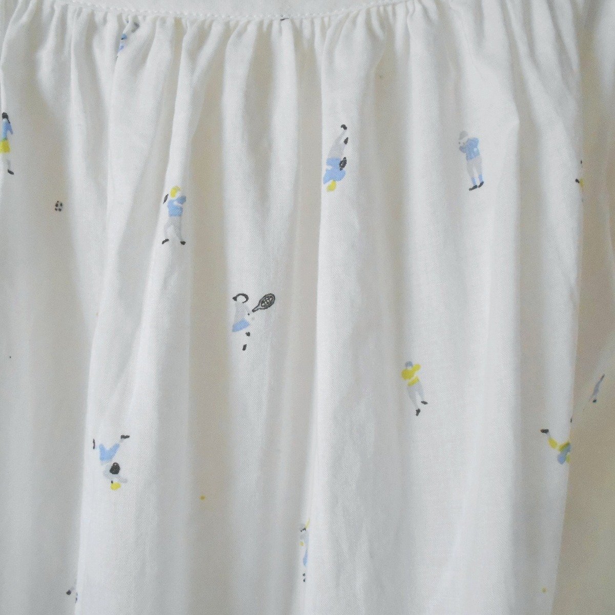 【ポイント】ルフのレディース用ブラウスになります。お色は白に近い薄いクリームベースで、柄はテニスやサッカー、野球、等をしている人のプリントが全体に入っています。