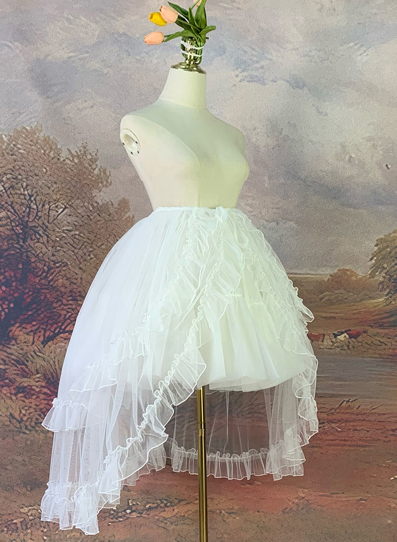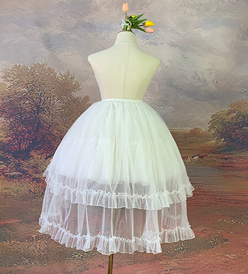 長さの異なるチュールを2枚重ねた、 ふんわりとした印象を与えるオーバースカートです♪ 裾部分にはフリルが施され、より華やかな雰囲気に☆ 柔らかなチュール素材を使用しているため、肌触りが心地良いです。 ウエスト部分はリボンで結ぶタイプで、着脱も簡単です◎ ※この商品はオーバースカート1枚のみです。その他のものは含まれていません。 ◆カラー: ホワイト、生成り、ブラック ◆素材:ポリエステル ◆サイズ:XS、S、M、L、XL