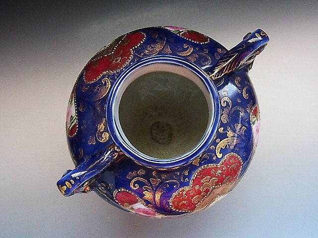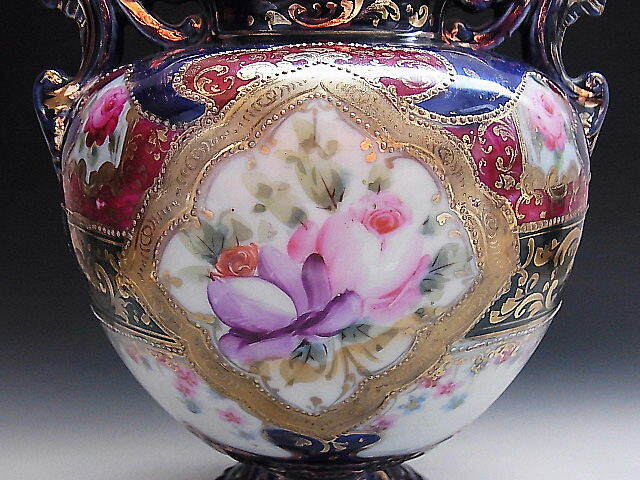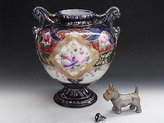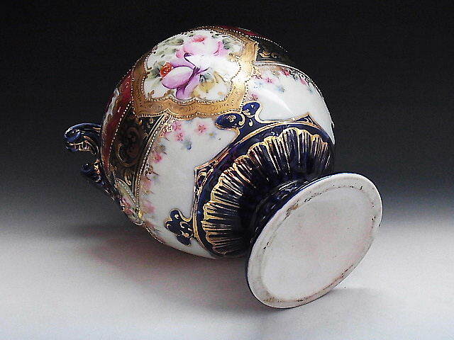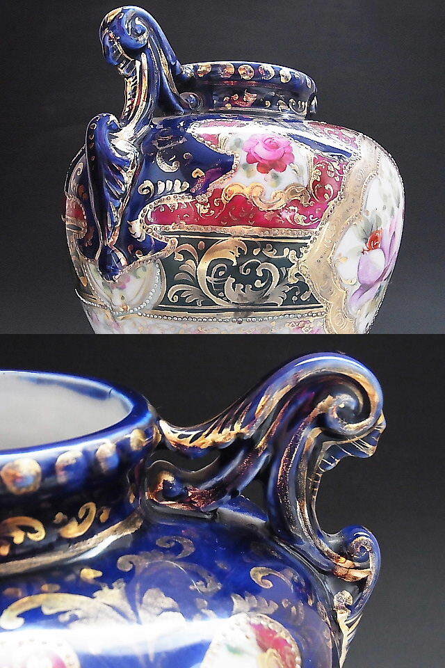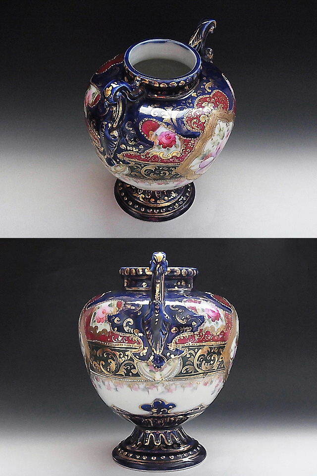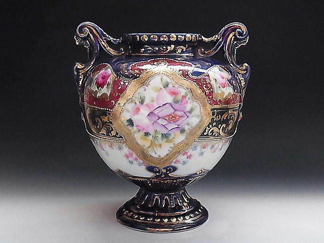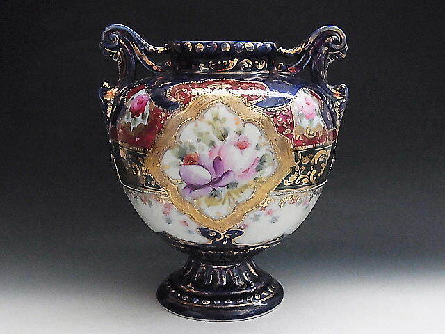 初期ニッポン輸出用の大きな花瓶です。 クラシックな彩色で描かれた花文様に金彩を添えてコバルトブルーが美しい作品です。 輸出国表示施行前の作品で窯元は不明です。 状態はほぼ完全美品です。 年代は明治中期~後期の米国向け作品です。 大きさは両ハンドル間の長さが18㎝、口の直径が7.7㎝、全高が22㎝ あります。 送料は3200円頂きます。 支払いはYahoo!かんたん決済、または銀行振込みでお願いします。 日本以外への海外発送も承ります。 ご入金確認後支払2日以内にアメリカより航空便でお送りいたします。 発送後通常4~10日でお届けいたします。 複数品落札の場合は送料をまとめて計算させて頂きますのでお得になります。 私共は経済産業省の定める特定商取引法を順守しております。 当方の所在地住所等は出品者の自己紹介情報欄をご覧ください。 ご質問等ございましたらお気軽にお問い合わせください。   他にもオールドノリタケを中心に沢山出品しておりますのでここをクリックしてご覧ください。