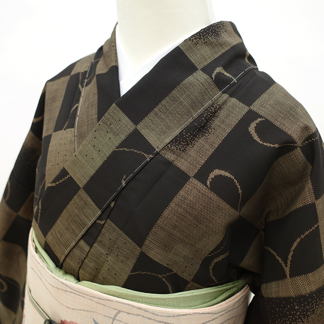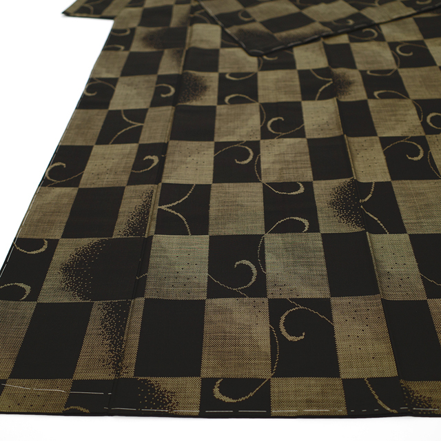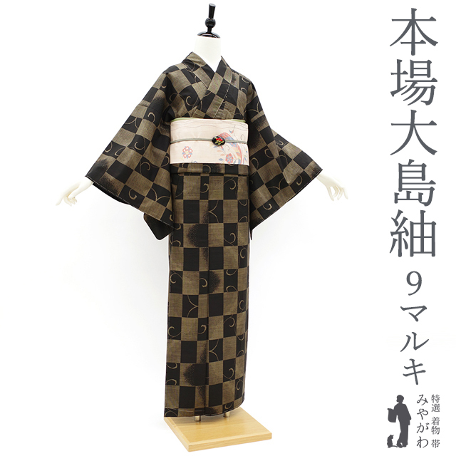 本場大島紬 袷 着物 9マルキ カタス式 泥染 黒こげ茶 ベージュ 市松 唐草 新古品 仕立て上がり 身丈161 裄66.5 Mサイズ みやがわ sb14326