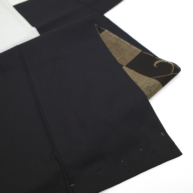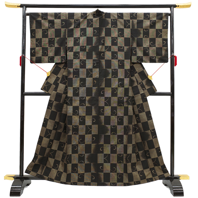 こちらのお着物は、泥染めの特徴でもある黒こげ茶地。