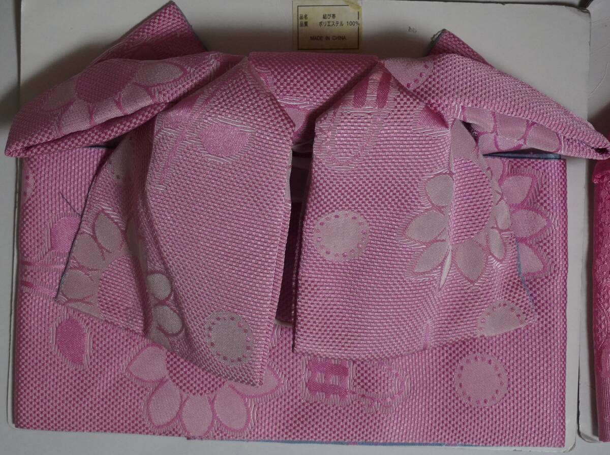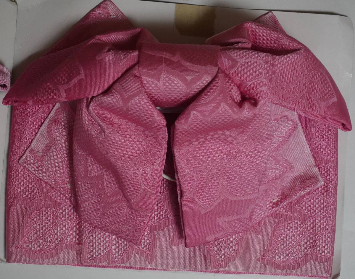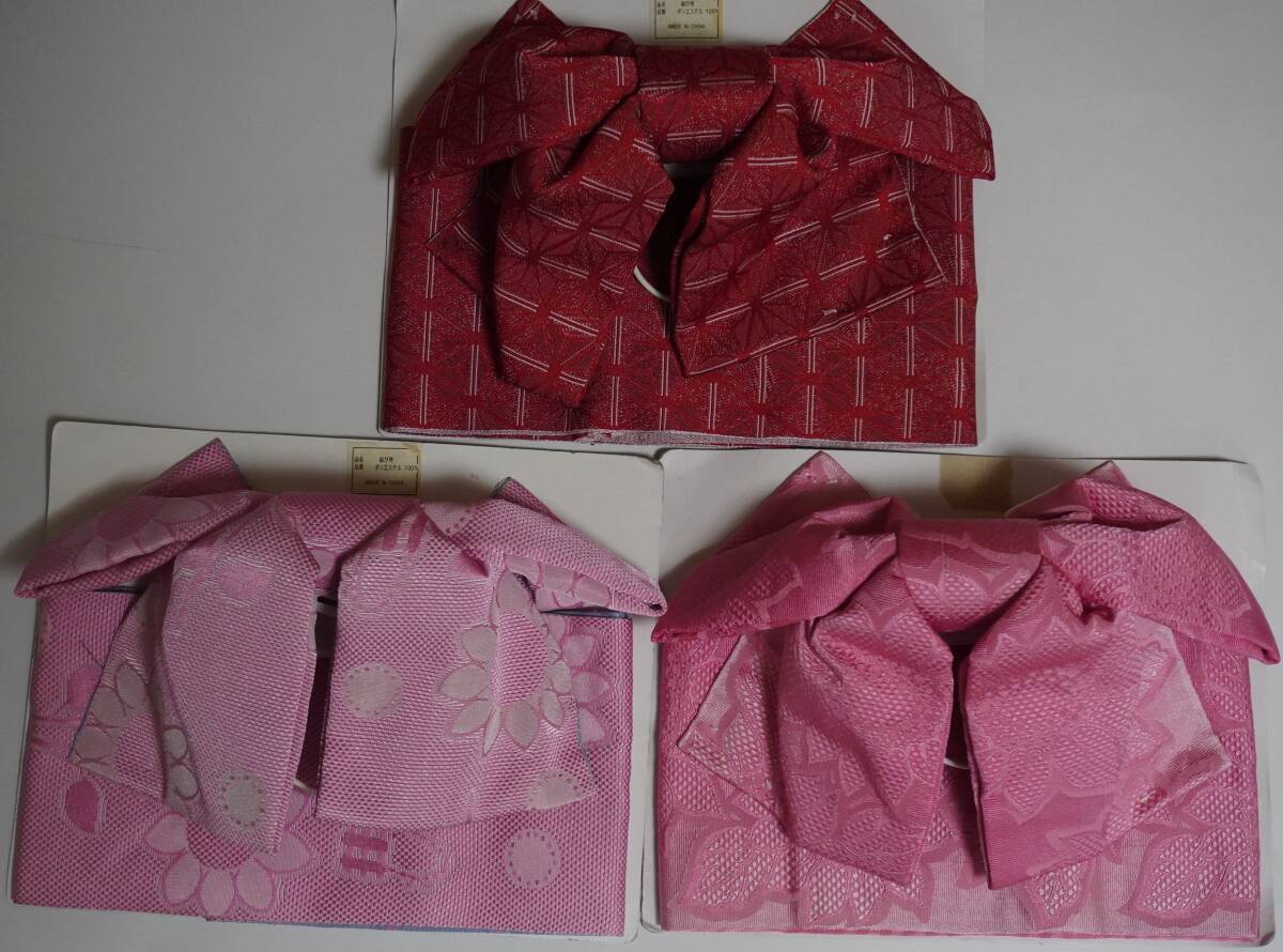 女性yukata用、地紋柄結び帯 臙脂x1、くすみピンクx1、ぴんく色ぼかしx1 (3点セット )ポリエステル 新品(波状の写りはレンズの光学的ないたずらで現品にはありません、また薄く濃く写っている場合もあります)、胴部--帯巾約16,5cmx長さ約130cm、リボン部は横に約30cm。見た範囲で汚れないと思いますが、着用に差し支えない薄汚れなど(多分ない?)はあってものお値段で出品です。