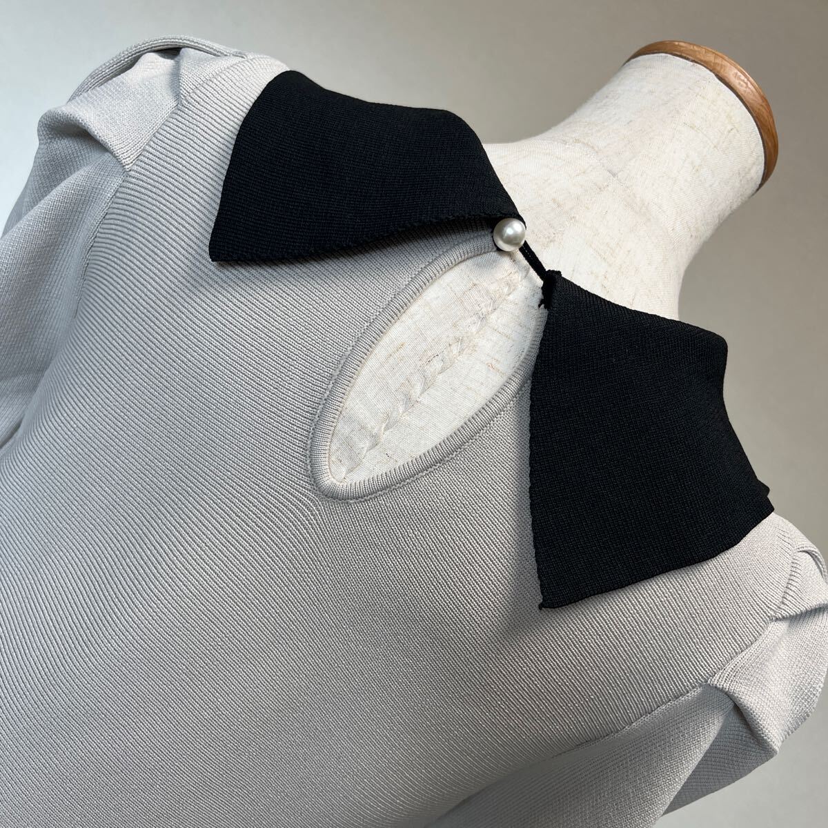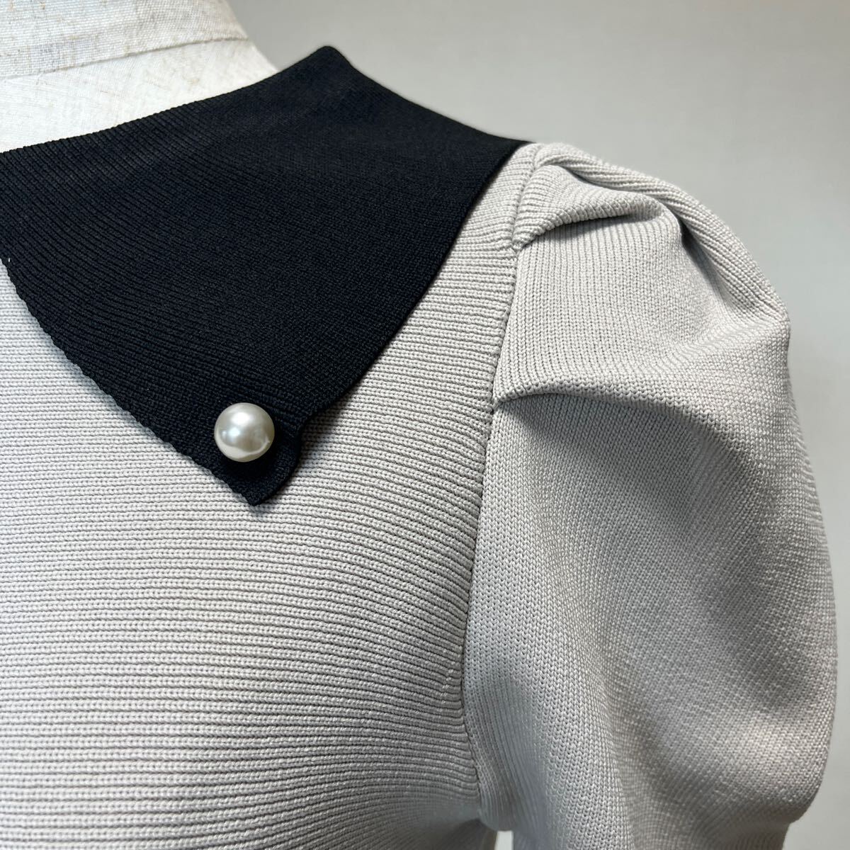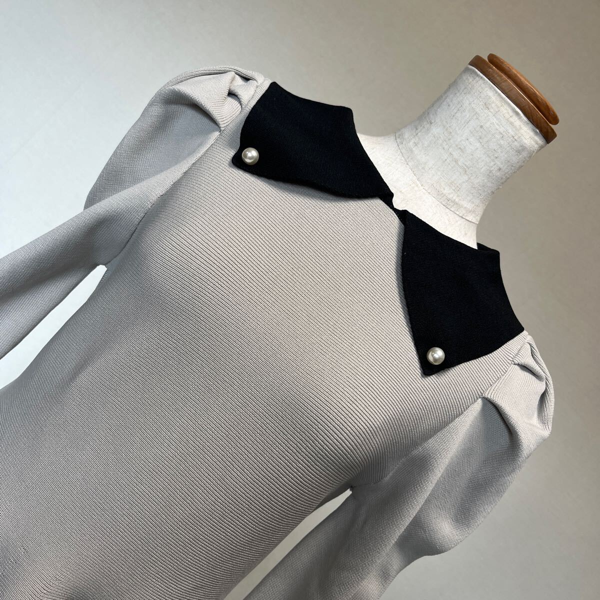 6-6新品 長袖ニット襟付きシャツワンピース タックスリーブボリュームフレアニットワンピースパール釦 グレイッシュベージュ 9号 M