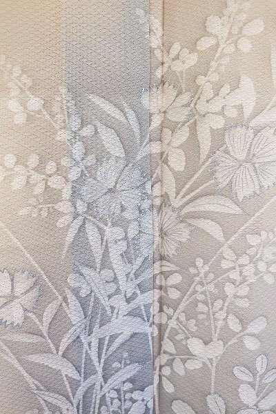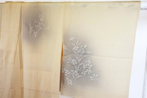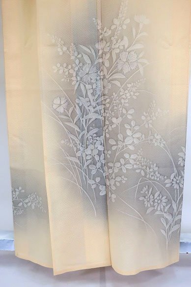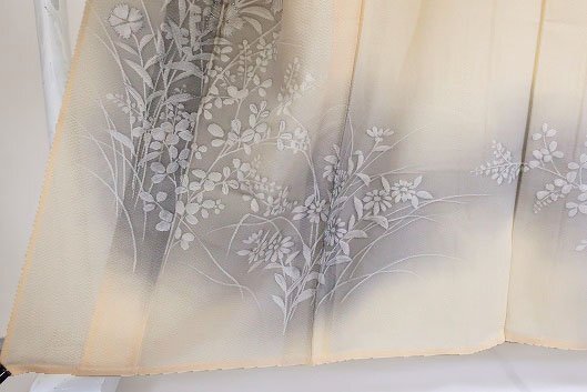 オレンジみのクリーム色の絽織地に萩や撫子などの秋草文様が描かれた訪問着です。 優しい色合いが素敵な一枚です。 担当:伊藤 |