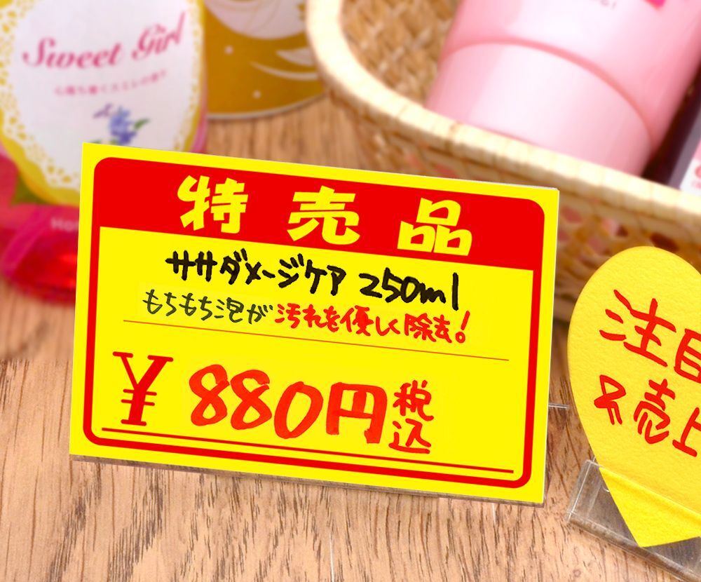 全面黄色の用紙を使用し、文言が入っているので簡単にPOPを作ることができます。
