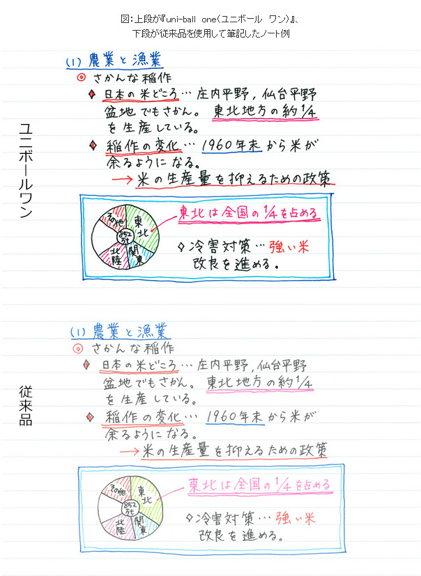 一般的なゲルインクと比べて、黒色はより一層濃く発色します。当社と立命館大学との共同研究により、黒色に関して、濃く、くっきりとした文字ほど記憶に残りやすいことがわかりました。一般的なゲルインクよりも濃い『uni-ball one(ユニボールワン)』を使用することで、ノートを見返した時に印象に残りやすい文字を書くことができます。