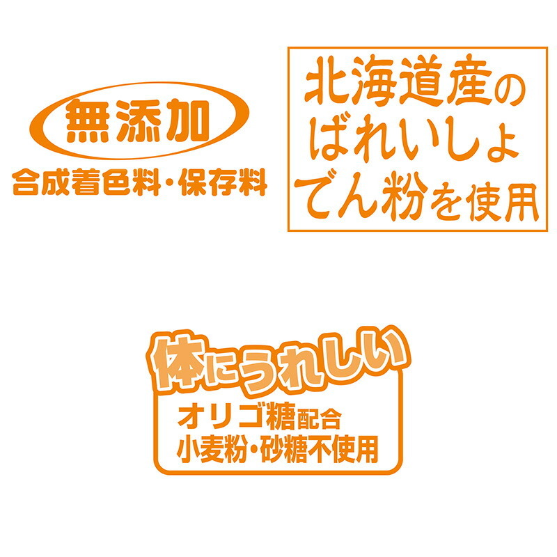 馬鈴薯でんぷん、水飴、卵類、オリゴ糖、還元麦芽糖、さつまいも、トレハロース、加工でんぷん、香料、着色料(クチナシ・パプリカ)