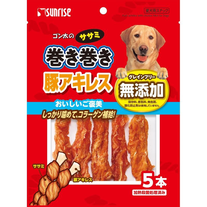 適度な噛み応えの豚アキレスにワンちゃんの大好きな鶏ササミを巻いた嗜好性の高いスナックです。豚アキレスのコラーゲンが補給でき、噛むことでストレス解消・歯の健康にも役立ちます。