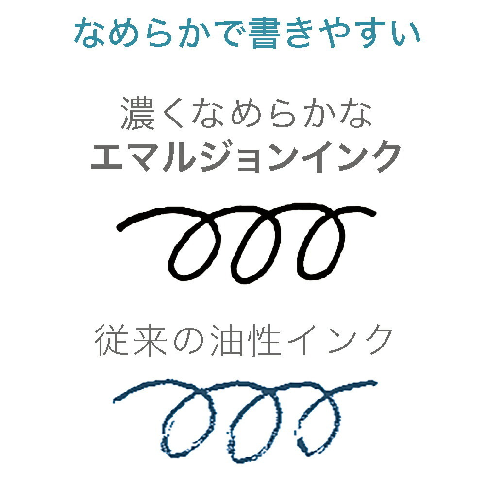 油性のしっかりした手ごたえと、水性のさらさらした軽さを兼ね備えたエマルジョンインクを搭載し、なめらかな書き味と鮮やかで濃い筆記線を実現しています。