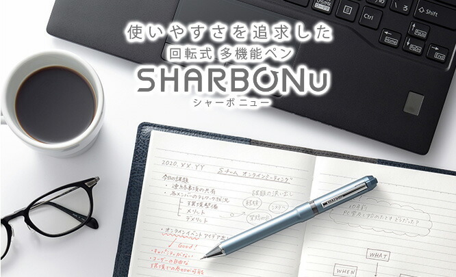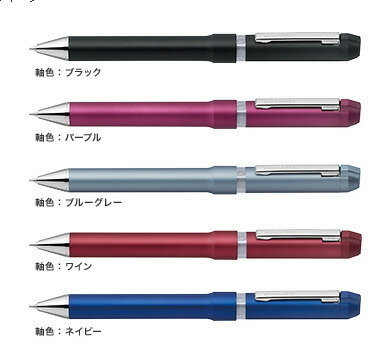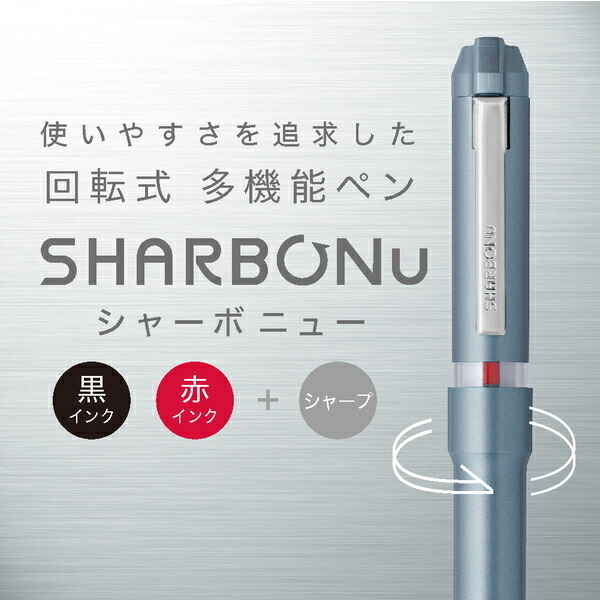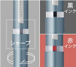 1本で黒・赤2色のボールペンとシャープペンが使えます。軸を回転させるとクリップ下の窓の中のサインの色が変わり、使用中の機能がわかります。