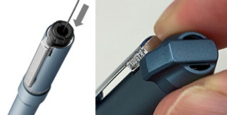 シャープ芯の補充は、上部の消しゴムカバーをひねって外すことで手間なく簡単におこなうことができます。