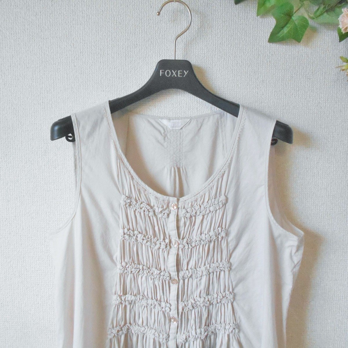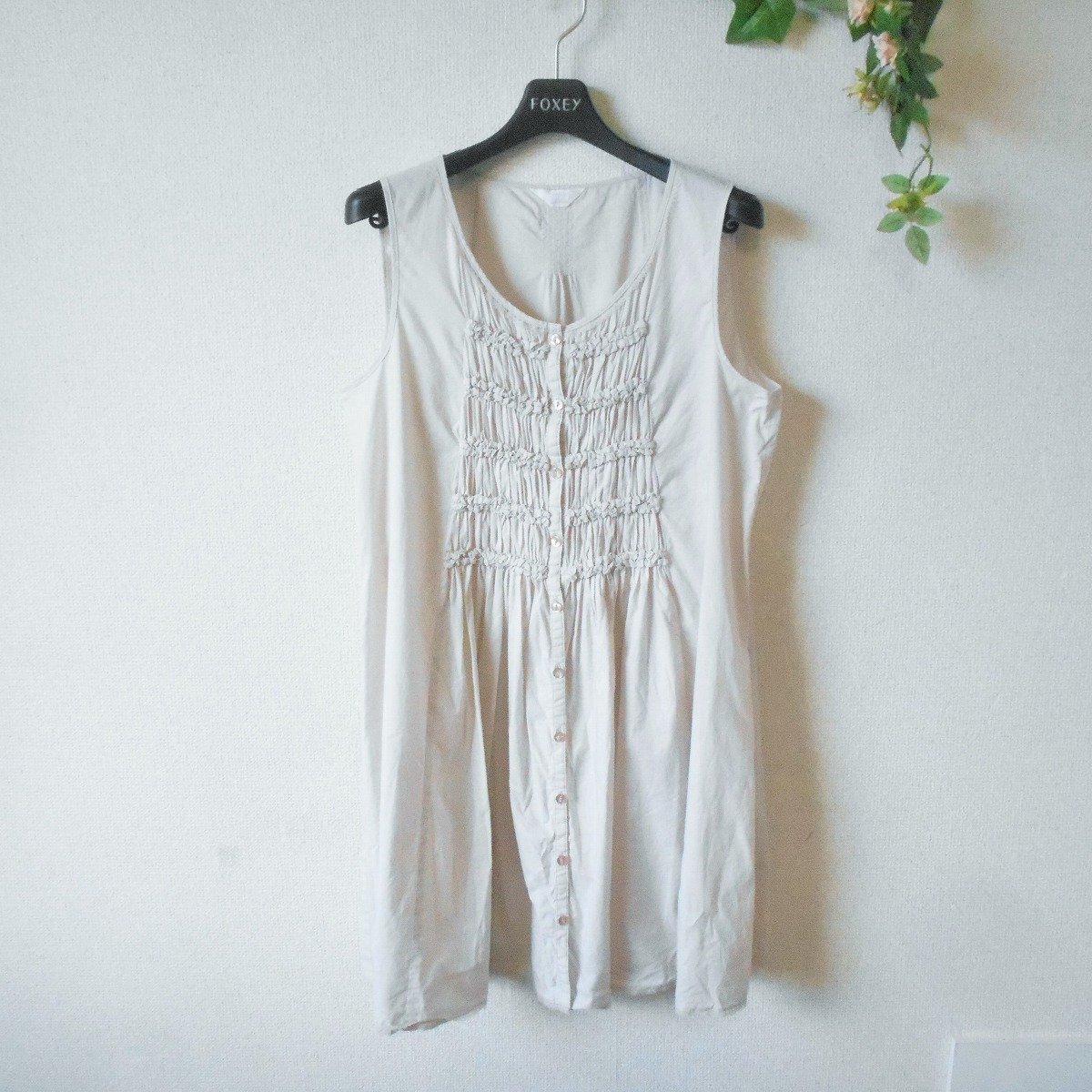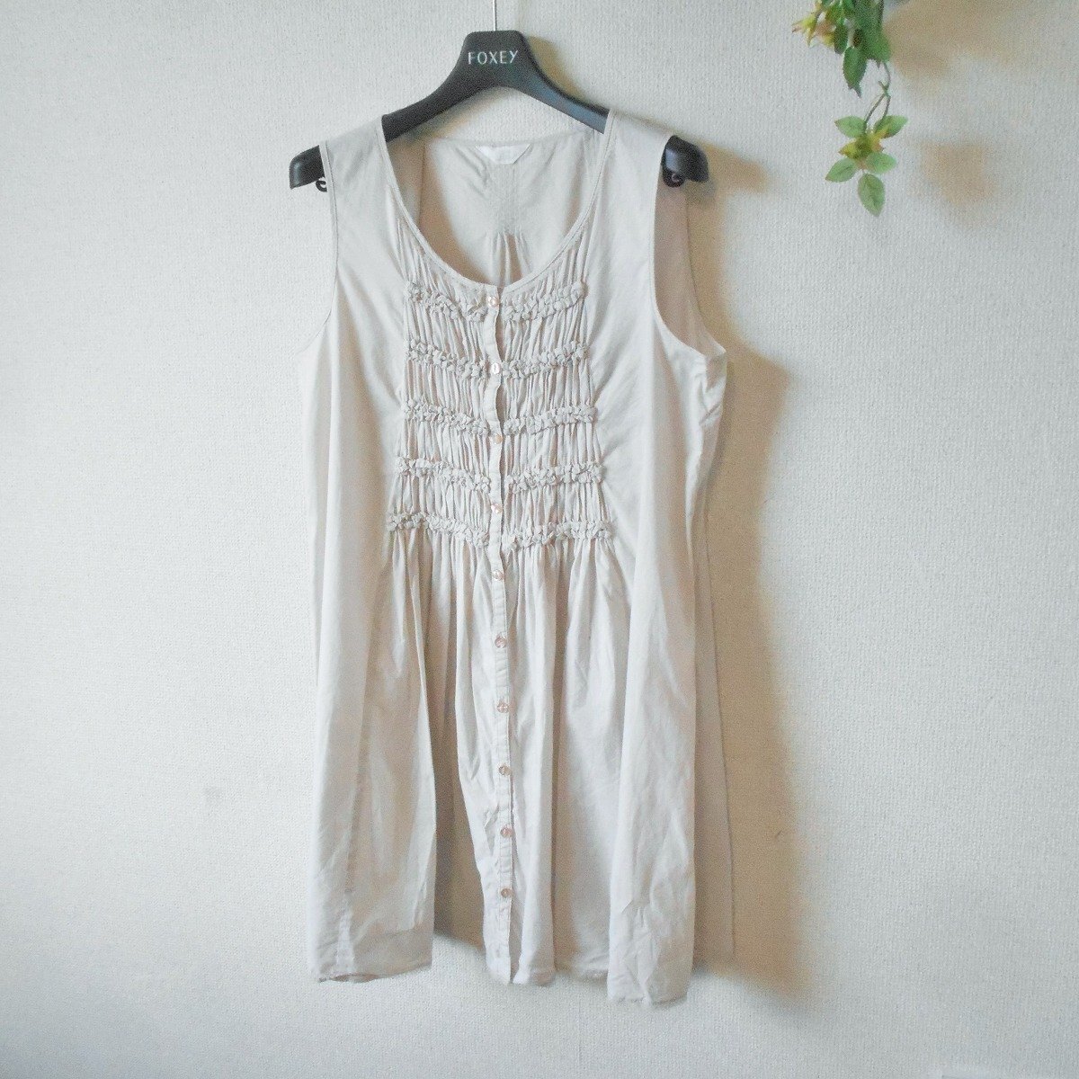 【ポイント】インゲボルグのノースリーブチュニックになります。お色は薄いグレー系で胸の部分はゴムの入ったシャーリングが使用されています。襟ぐりと裾にはレースが使用されていて、とっても素敵な一着です。