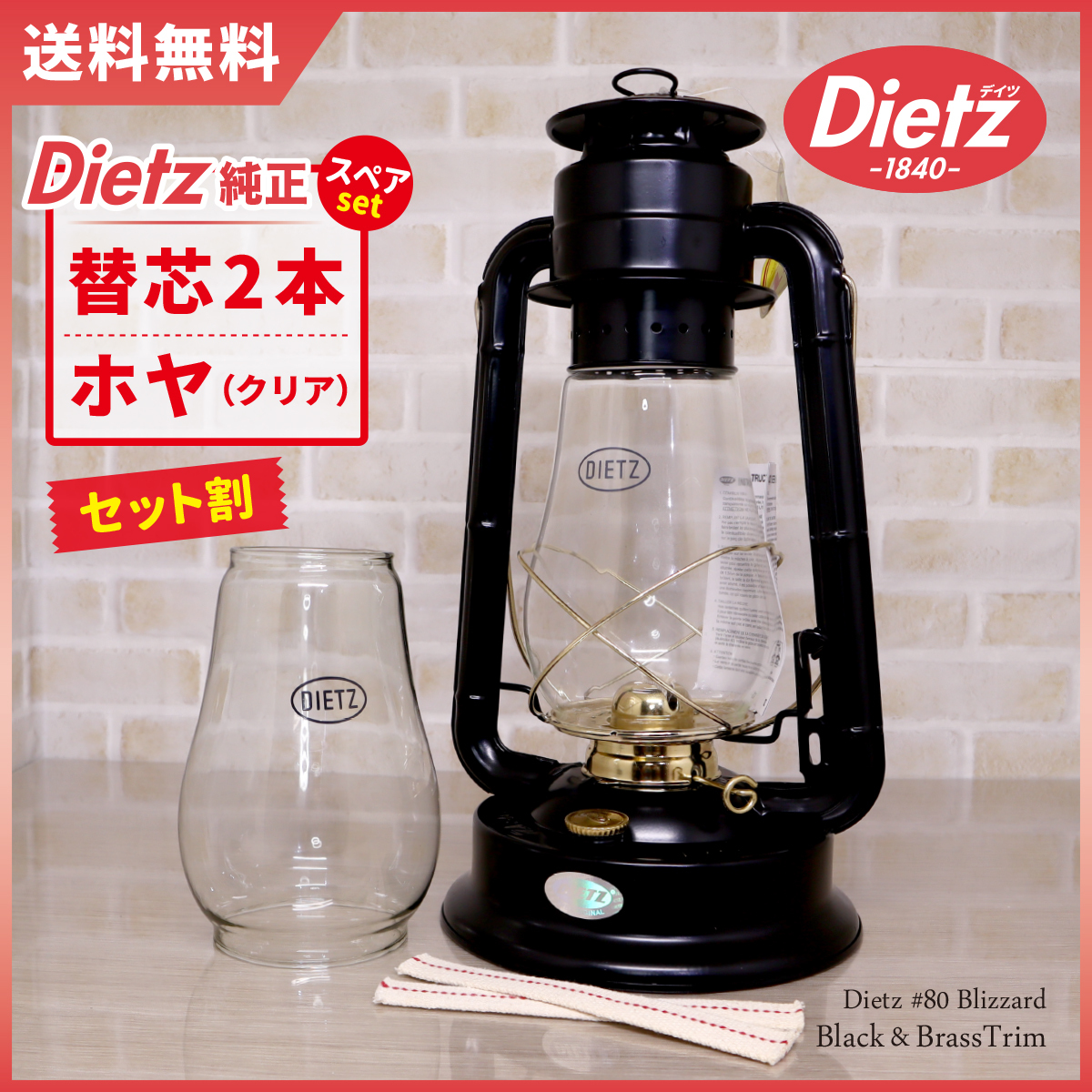 ホヤセット【送料無料】新品 Dietz #80 Blizzard - Black Brass Trim 真鍮メッキ / 替芯 ◇デイツ 黒金 ブラック 大型 ハリケーンランタン