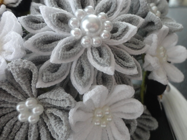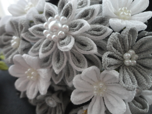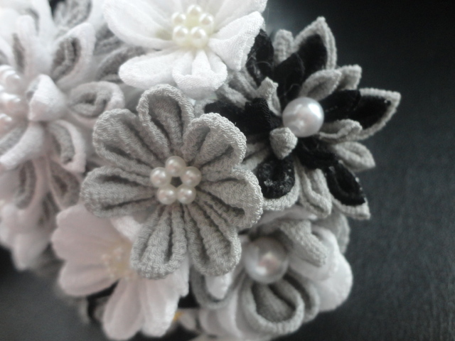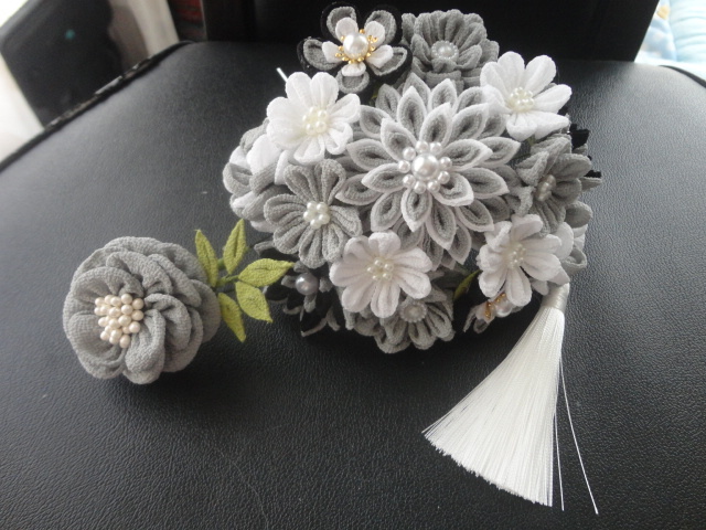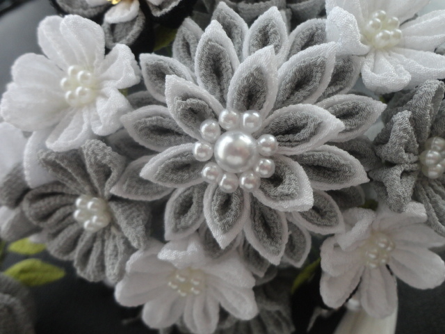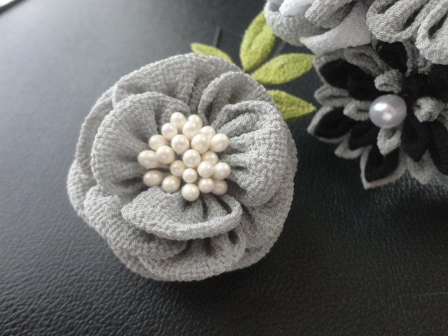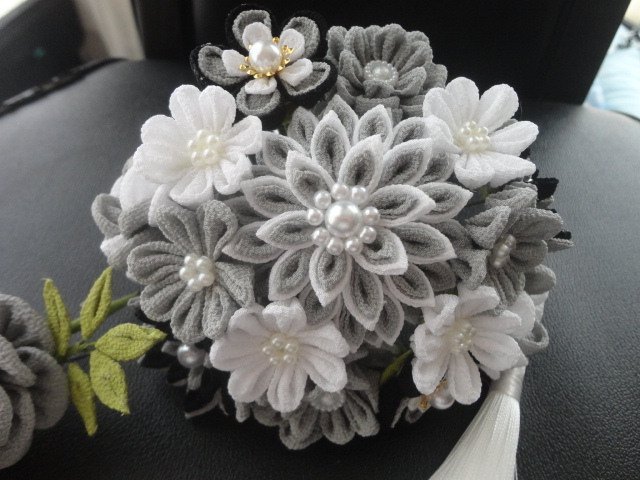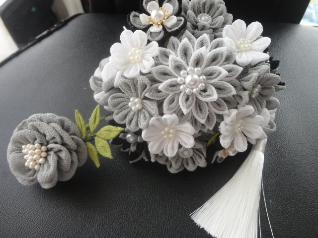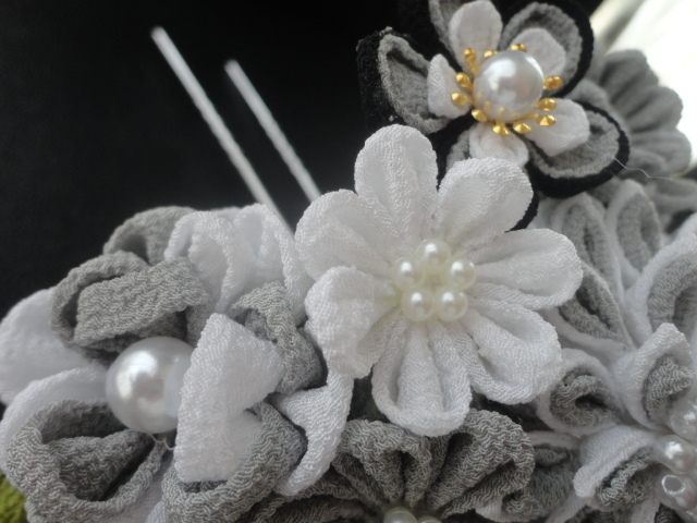 大きさ:(花大)縦13.0cm×横16.0cm(かんざし) (花小)縦5.0 cm×7.0cm(Uピン) 黒い髪、茶色の髪にはよく映えます。 私の作品の中では最も製作することがないお色です。 黒系は目があまりよくないため夜間などは作ることができないこと、 ボンドのはみ出しがほかのお色より目立つことなどから、大変気を使います。 今後も出品は少ないお色だと思います。 八重のお花が好きで、八重のお花を沢山ぎゅっと集めました。<br> 一重よりも何倍もの布もたっぷり使い、 時間も手間も2倍、3倍とかかりますが、 立体的で大変華やかです。 小花・八重花は角度が変えられますので お好みに合わせて 角度を変えてください。 花の角度等で大きさは変わってきますので ご了承ください。 それぞれのお花が引き立つように お作りしております。 また発送の際はできるだけ平たくして お送りしております。 自分好みに花の角度を変え お使いください。 毎年浴衣など着物にあうものを作ってほしいという ご依頼を受けておりました。 娘用に昨年は沢山のかんざし等を作りました。 美容師の方にも「母の手作り」と いったところ大変ほめていただけた そうです。 色違いで出品しております。 簡単な単品も出品しております。 ちりめん布を購入し、布のカットからすべて手作業で自分で行っております。 ********************************* ●一つ一つ丁寧にお作りしておりますが、 素人の手作り品ですので 完璧なものをお求めの方・細かな点までおきになさる方の ご入札・ご落札はご遠慮ください。 人により感じ方は全く違います。既製品のようにぴったり すべてが同じにはお作りできません。 またボンドのはみ出し等もあるかと思います。 (ボンドの経年劣化で使えなくなってしまうのは困られると思い 以前はたくさんのボンドを使用しておりましたが、 ある落札者様から ご指摘があり、 必要以上のボンドは現在使っておりません 2019/02/07~) ●分からないことがありましたら、 細かな点まで必ずご質問お願いします。 思い込みによるクレーム等は 固くお断りさせていただきます。 ご納得の上でご購入 いただきたいと思います。 | ||