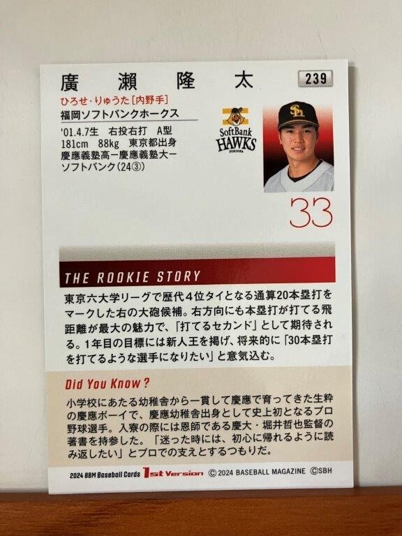 【2024 BBM 1st】239廣瀬隆太(福岡ソフトバンクホークス)レギュラーカード RC ルーキーカード