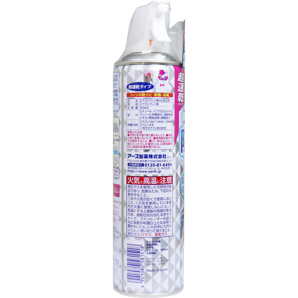 自動お掃除機能付きエアコンにも! 使いやすい超速乾タイプでエアコンの気になるカビを最長2ヵ月おさらば! エアコンの気になるカビをスプレーするだけで最長2ヵ月防ぎます。 超速乾タイプで処理後すぐにエアコンを使用できます。 (全てのカビを除去するわけではありません。) ・スプレーするだけで、フィンに発生したカビの原因菌を除菌し、カビの生育を防ぎます。 防カビ効果は最長2ヵ月持続。 ・消臭成分緑茶ポリフェノールと柿抽出物をW配合。 カビなどのニオイをすっきり消臭。 ・使用後もすぐに乾燥してエアコンを使用できるので、ニオイが気になるときにいつでも気軽に使えます。 ※使用環境により異なります。 全てのカビや菌を除去するわけではありません。 個装サイズ:62X239X61mm 個装重量:約365g 内容量:350mL 製造国:日本 【発売元:アース製薬株式会社】 【エアコンフィン用カビ防止剤】 【成分】 エタノール、イソプロピルメチルフェノール(除菌成分)、緑茶乾留エキス・柿抽出物(消臭成分) 【効果・効能】 フィンの防カビ・除菌・消臭 【使用方法】 (1)ツメを折り取る。 (2)電源OFF、必ずプラグをコンセントから抜き換気。 (3)エアフィルターを外す。 (4)フィン(熱交換器)を露出させる。 (5)缶を振らずにフィンから5cmほど離してフィンの向きにそってスプレー(60~70秒間スプレーしたら完了)。 ※逆さでスプレーしないこと。 (6)エアフィルターを戻したらすぐにエアコンを使用できる。 ※自動お掃除機能付きエアコンにも使用することができます。 (※センサー部分や配線部分には処理しないでください。) 【使用量の目安】 エアコン1台につき60~70秒間スプレーする。 (1本でエアコン約2台分) 【効果持続期間】 防カビ効果:最長2ヵ月(使用環境により異なります。 全てのカビや菌を除去するわけではありません。) 【使用上の注意】 ・子供の手の届く所に置かないこと。 ・用途以外に使用しないこと。 ・万一飲み込んだり、目に入ったりした場合には、応急処置を行い、医師の診療を受けること。 【警告】 ・必ず用法用量を守って使用すること。 エアコン電装部(センサーや電子基板、スイッチ、モーター等)には、決して噴射液がかからないようにすること。 誤った方法で使用すると、電気部品の故障等の原因となる場合があります。 ・人体に向けて使用しないこと。 ・アレルギーやかぶれなどを起こしやすい体質の人は、薬剤に触れたり、吸い込んだりしないこと。 ※ガス警報器の近くで使用すると、警報器が誤作動することがあります。 【使用できないエアコン】 天井埋込タイプ、天井吊り下げタイプ、床置タイプ、窓取付けタイプ、カバーの開けられないエアコン、カーエアコン ※室外機、送風口、クロスフローファンには使用できない。 【応急処置】 ・万一、飲み込んだ場合は、吐き出させて直ちに医師の診療を受けること。 ・誤って目に入った場合は清水で十分洗い流し、また顔や皮膚に付着した場合は石けんで十分洗い流し、異常があれば医師の診療を受けること。 注意事項 予告なく成分・パッケージが変更になることがございます。 予めご了承ください。 *予告なく成分・パッケージが変更になることがございます。予めご了承ください *ダンボールを使用して発送する場合には、入数以下の個数の場合、 中古ダンボールを使用する場合があり、ご注文の商品とは異なるダンボールになる場合があります。 あらかじめ、ご了承ください。 |