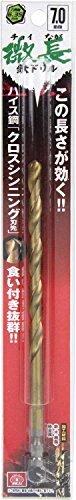 「SK11 六角軸 鉄ドリル 微長 チョイなが 7.0mm」▼4977292336321▼(商品説明)微長・ゴールド 7.0mm 7.0mm・・Size:7.0mmStyle:微長・サイズ:7.0mm・標準穴あけ可能厚:(鉄)2.0mm・(木)らせん溝長の2/3程度・軸:六角軸6.35mm・使用電動工具:充電式インパクトドライバー・ドリルドライバー・電気ドリル・加工材料:鉄・木・樹脂・軽金属説明 この長さが効く、ハイス鋼クロスシンニング刃先で食い付き抜群の微長鉄ドリル 【用途】 鉄、木、樹脂、軽金属の穴あけ 【特徴】 ・ハイス鋼(HSS)にチタン(Tin)をコーティング、耐熱性能が上がり長寿命 ・六角軸なのでインパクトドライバーなどのチャックに直接セットできる ・クロスシンニング刃先で食い付き抜群 【注意事項】 ※用途以外のご使用はしないで下さい。 ※ご使用前に本製品に亀裂や欠け、軸のゆるみがないかご確認下さい。 ※使用する電動工具本体の取扱説明書をよく読み正しくご使用下さい。 ※保護メガネやマスク等の作業に適した服装でご使用下さい。 ※まわりの安全をご確認いただきご使用下さい。 ※揮発性可燃物(ガソリンやシンナーなど)の近くではご使用にならないで下さい。 ※ドリル刃には十分注意して下さい。 ※加工材料は動かないようにしっかり固定して下さい。 ※使用後のドリル刃及び加工材料は高温になります。 ※ドリル推奨回転数を目安に使用下さい。 ※市販の水溶性切削油のご使用をお勧めします。 ※無理な負荷をかけてご使用にならないで下さい。