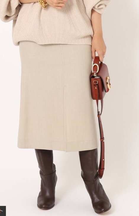 ヒップ、腰周りはタイトですっきり、裾にかけて少し広がったフレアタイトなシルエットが硬すぎず色気を感じる1枚。