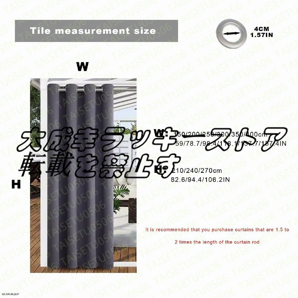 覗き見からの完璧な万能保護、必須の日差し、雨よけ、バルコニーや庭の理想的な装飾を提供します。 防水生地を採用し、長期間の使用が可能で、雨や雪の天候でも安定した状態を維持できます。質感のある外観の屋外カーテンは、垂直効果が高く、ループのおかげで組み立てが簡単です。お友達への理想的なギフトです。灼熱の太陽の下でも週末やパーティーに最適な居心地の良い場所を作りましょう。製品名: GUAWJRZDP ガゼボカーテン製品の色: ベージュ、ダークグレー、ライトグレー、ブラウン素材: ポリエステル遮光率:90%タイル張りサイズ幅: 150/200/250/300/350/400cm59/78.7/98.4/118.1/137.7/157.4インチタイル張りのサイズ高さ: 210/240/270cm82.6/94.4/106.2インチ該当するシーン:屋外、ガゼボ、サンルーム、バルコニー、屋内、ポーチなど。※カーテンには穴あきが入っているため、縦方向のプリーツ効果を発揮するには、カーテンレールの2倍以上の長さのカーテンを購入することをおすすめします。※生地の伸縮性により、測定方法により多少の誤差が生じる場合がございますので、ご了承ください。