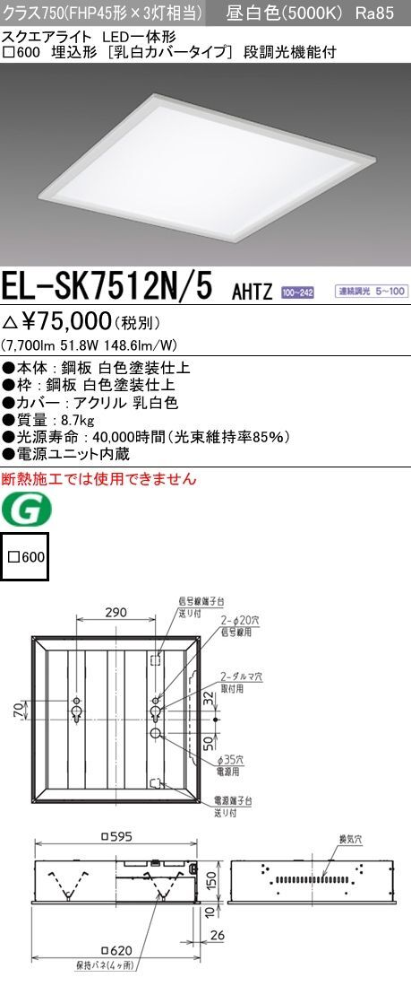 LEDスクエアライト 5000K 電源内蔵 調光可 □600 クラス750 三菱電機 EL-SK7512N/5AHTZ