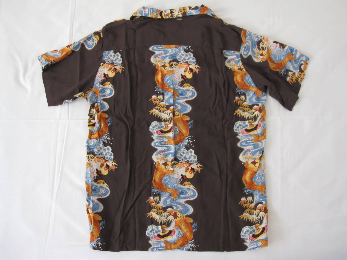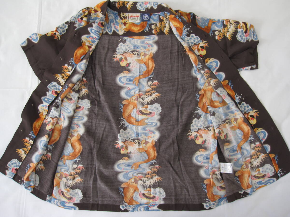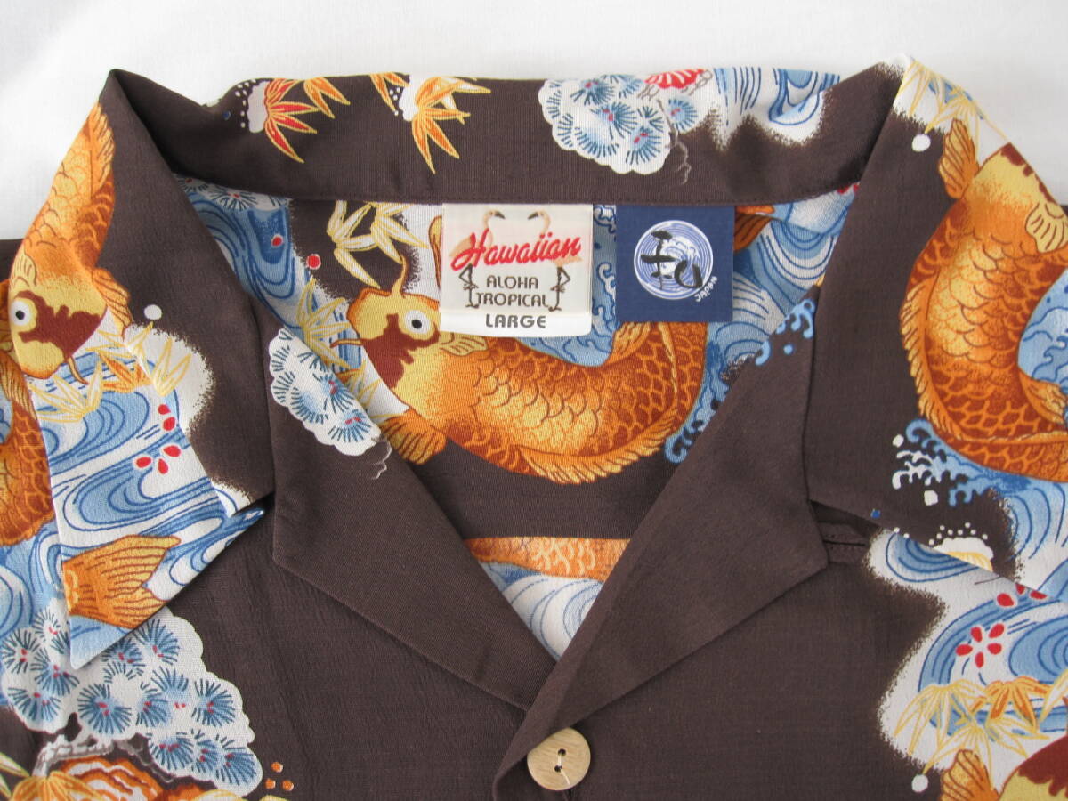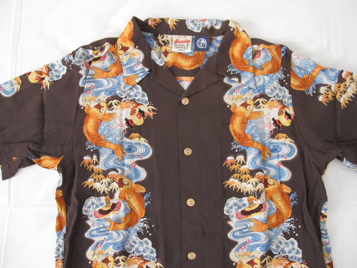 中古美品! ハワイアン アロハ トロピカル アロハシャツ 鯉柄 ブラウンベース サイズ(L) 素材(レーヨン 100%) 中国製 長期保管品