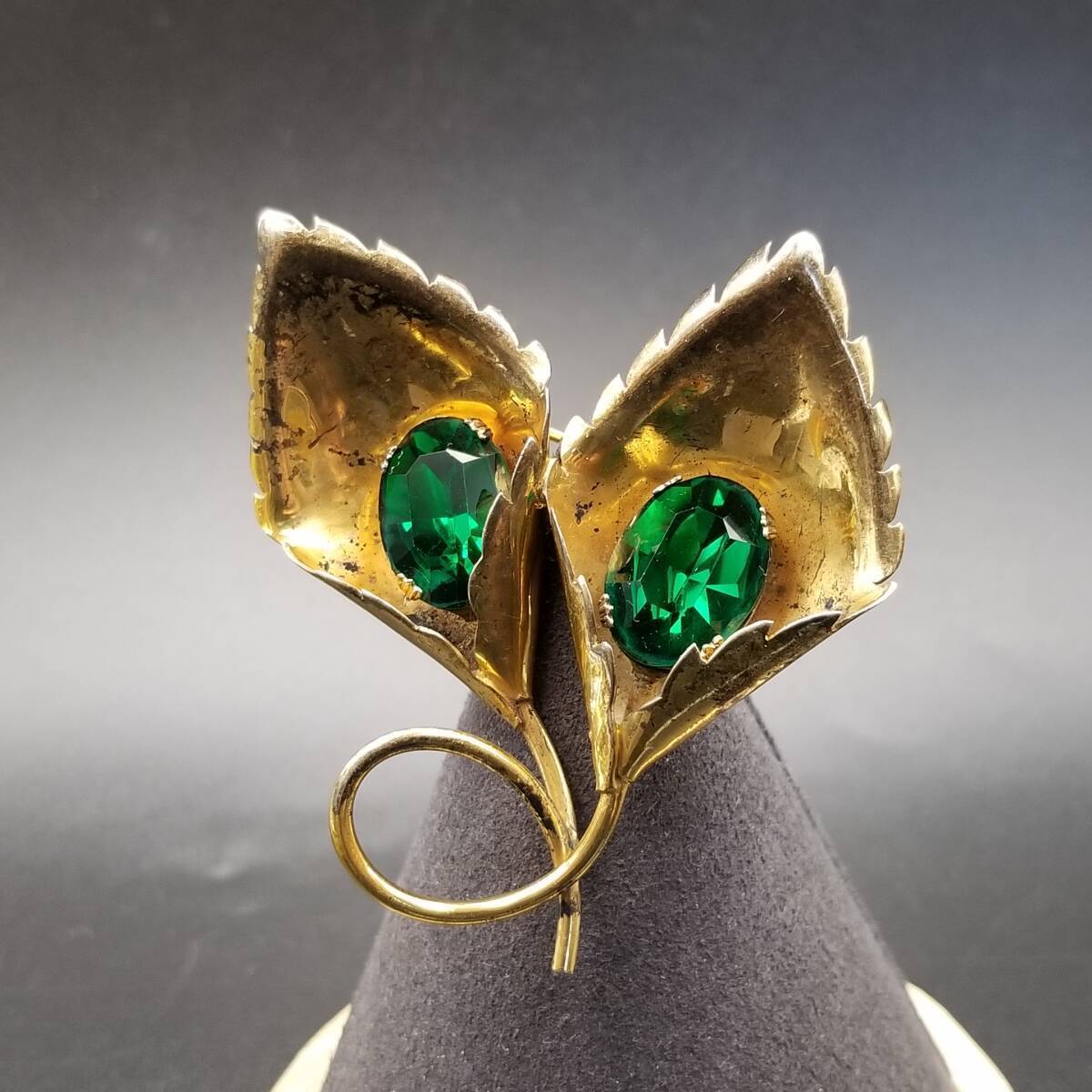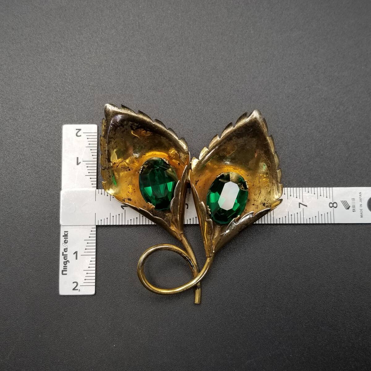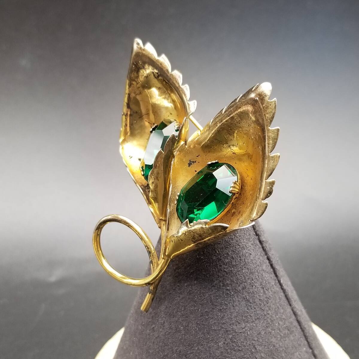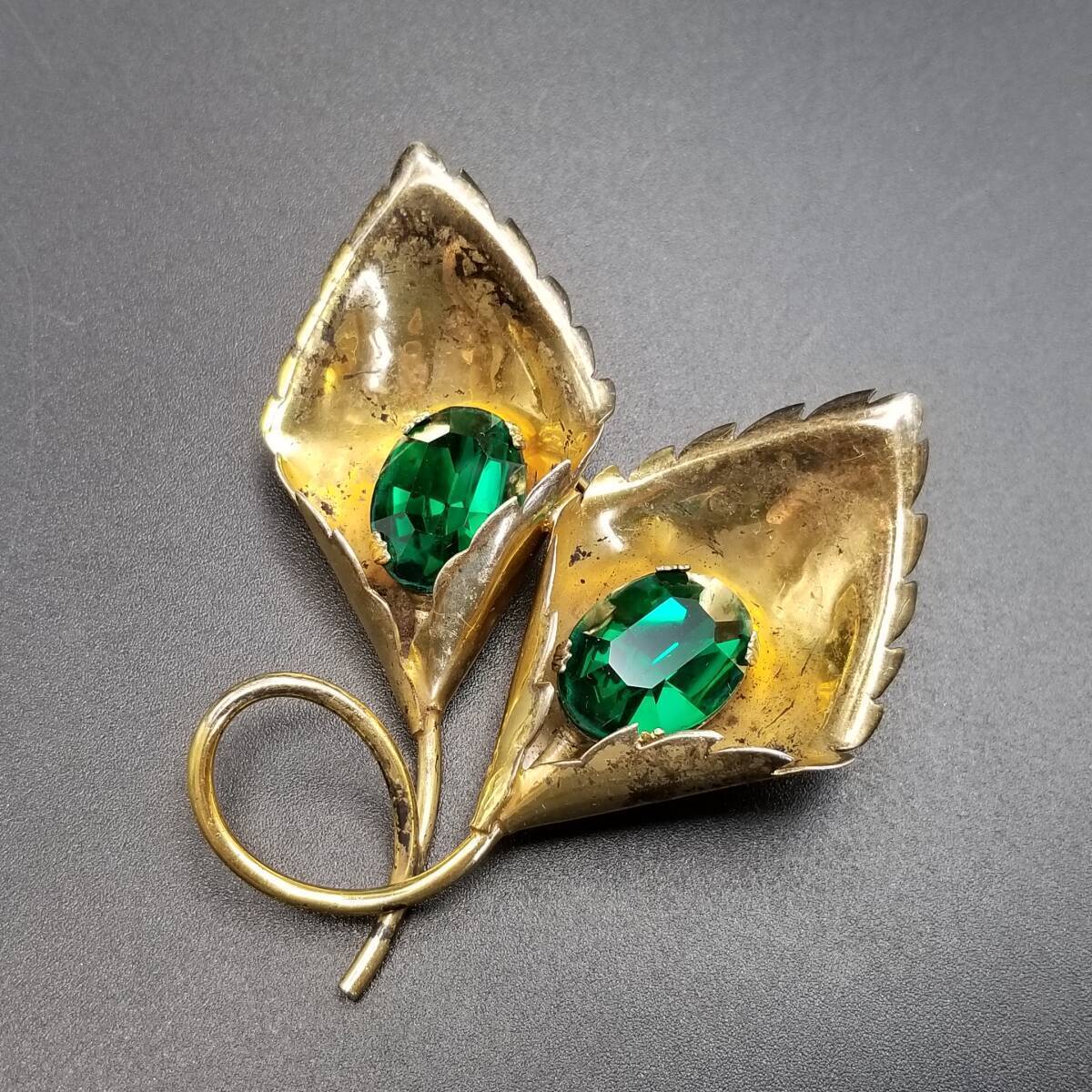 花 カラー モチーフ 925 シルバー ヴェルメイユ ヴィンテージ フワラー ブローチ 緑石アクセント ゴールドトーン 立体 存在感 Y15-A