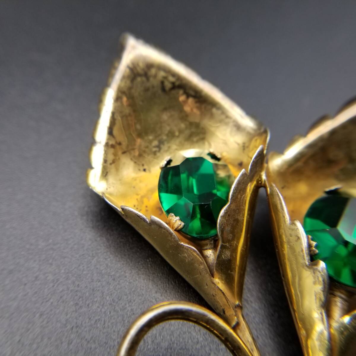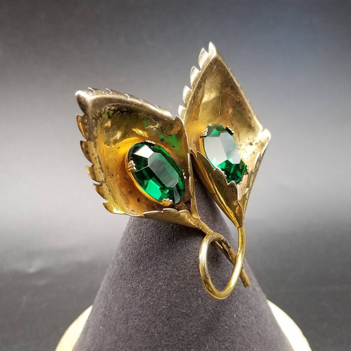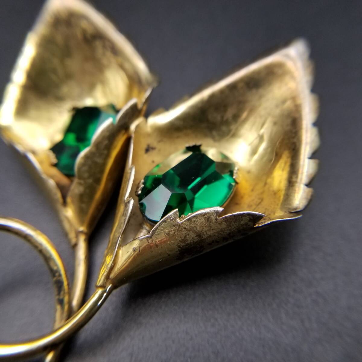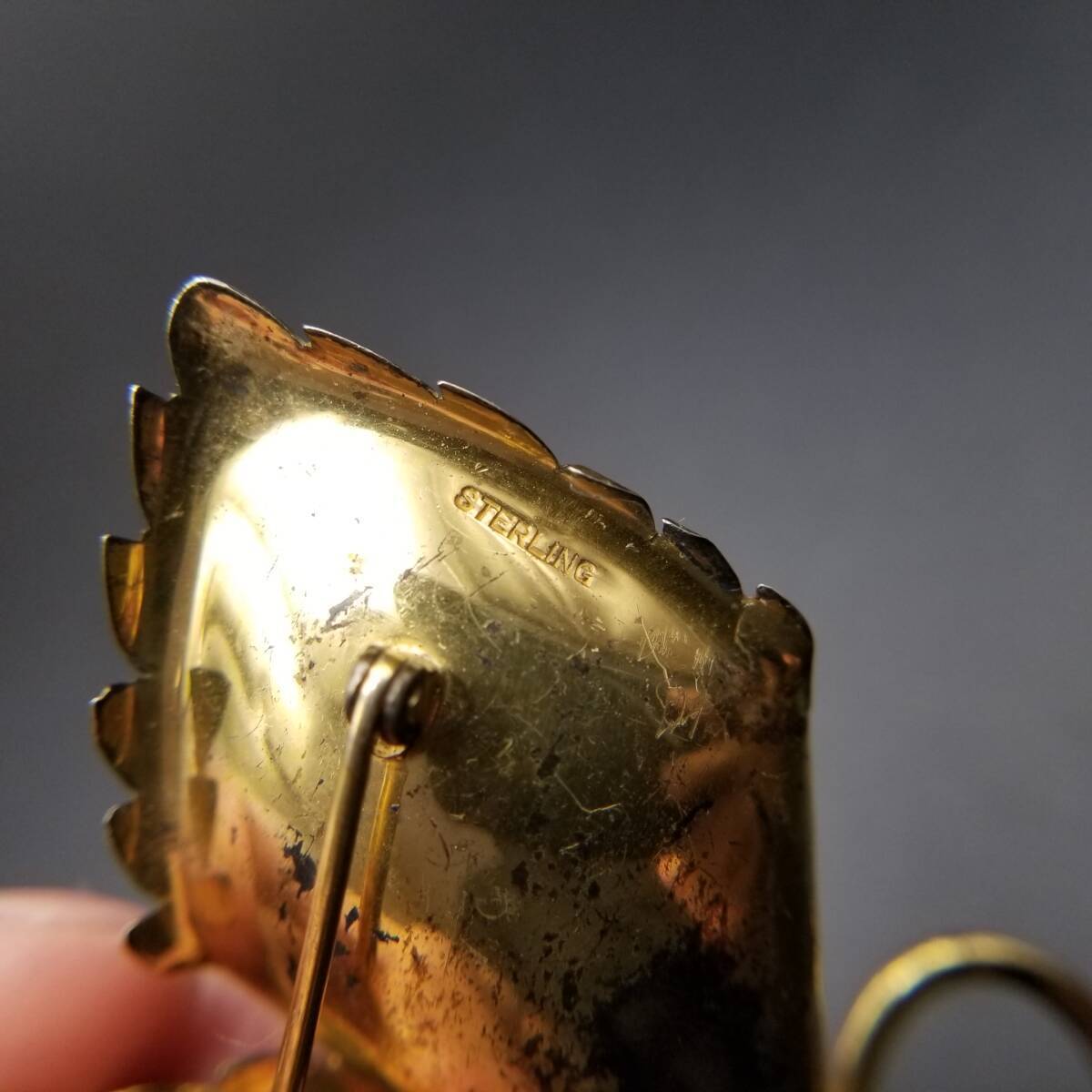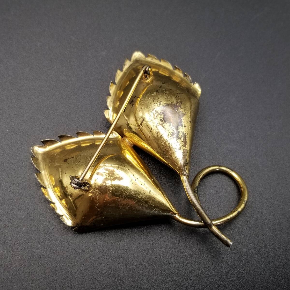 花 カラー モチーフ 925 シルバー ヴェルメイユ ヴィンテージ フワラー ブローチ 緑石アクセント ゴールドトーン 立体 存在感 Y15-A