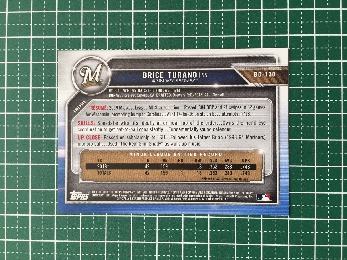 ★TOPPS MLB 2019 BOWMAN DRAFT #BD-130 BRICE TURANG[MILWAUKEE BREWERS]ベースカード 19★