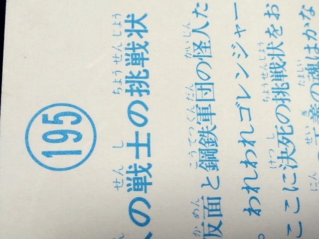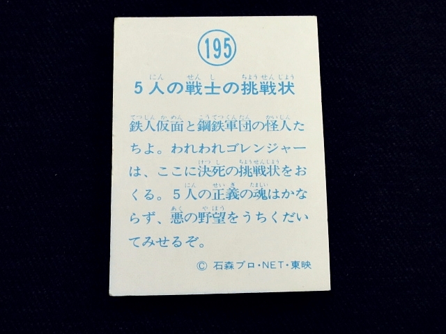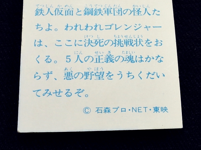 秘密戦隊ゴレンジャー ミニカード 70年代 バラ売り ・メーカー:山勝 ・1975年頃、当時の放送時に販売 ・6.6 cm x 5.0 cm ・同梱発送可能(複数落札の場合:定形、定形外郵便は、送料が変わる場合があります。) ・1-288番シリーズ ・1弾80種 001-080(タイトル違い.55.57.59.61.71.76.77,表修正.73) ・2弾32種 081-112 ・3弾64種 113-176 ・4弾48種 177-224 ・5弾32種 225-256 ・6弾32種 257-288 〓参考項目〓 ・原作:石森章太郎 ・脚本:上原正三 他 ・監督:竹本弘一 他 ・制作:テレビ朝日 ・放送期間:1975年4月- 1977年3月 ・全84話 〓出演〓 ・海城剛・アカレンジャー:誠直也 ・新命明・アオレンジャー:宮内洋 ・大岩大太・キレンジャー:畠山麦 ・熊野大五郎・2代目キレンジャー:だるま二郎 ・ペギー松山・モモレンジャー:小牧りさ ・明日香健二・ミドレンジャー:伊藤幸雄 ・江戸川総司令:高原駿雄 ・陽子・007:鹿沼えり ・黒十字軍総統:安藤三男、八名信夫 ・ナレーション:田中信夫、大平透 |