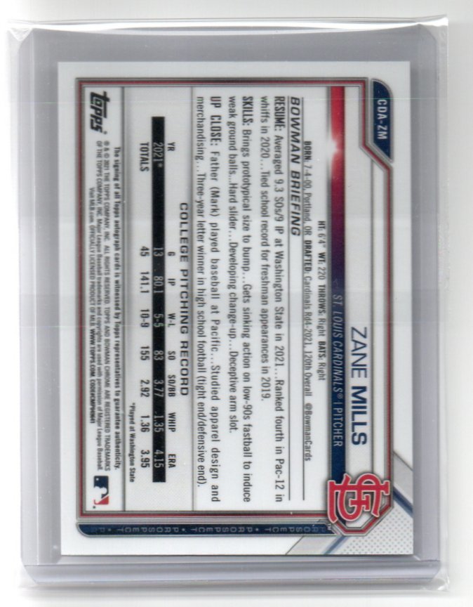 2021 Bowman Draft Baseball、「ZANE MILLS」 1st Bowman Purple Refractor Parallel Autograph Card (パープル・リフラクター直書き直筆サインカード)、250枚限定です、状態良好。