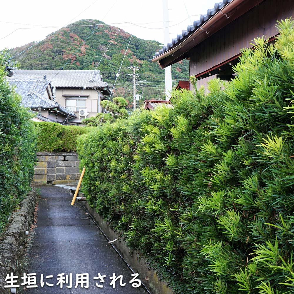 イヌマキは昔から生垣に仕様される品種です。ほかの樹種に比べて葉をしっかり付けながら成長しますので、長さ的な伸びが遅く一度生垣になったあとは手入があまり必要ありません。大気汚染や潮風にも強いです。耐陰性があり、萌芽力も強いです。枝は細かく密集しますので生垣や段作りのシンボルにされたりします。昔から和風生垣として、とても人気があります。根張りも強いですので防風林としても使われます。病気にも強いです。
