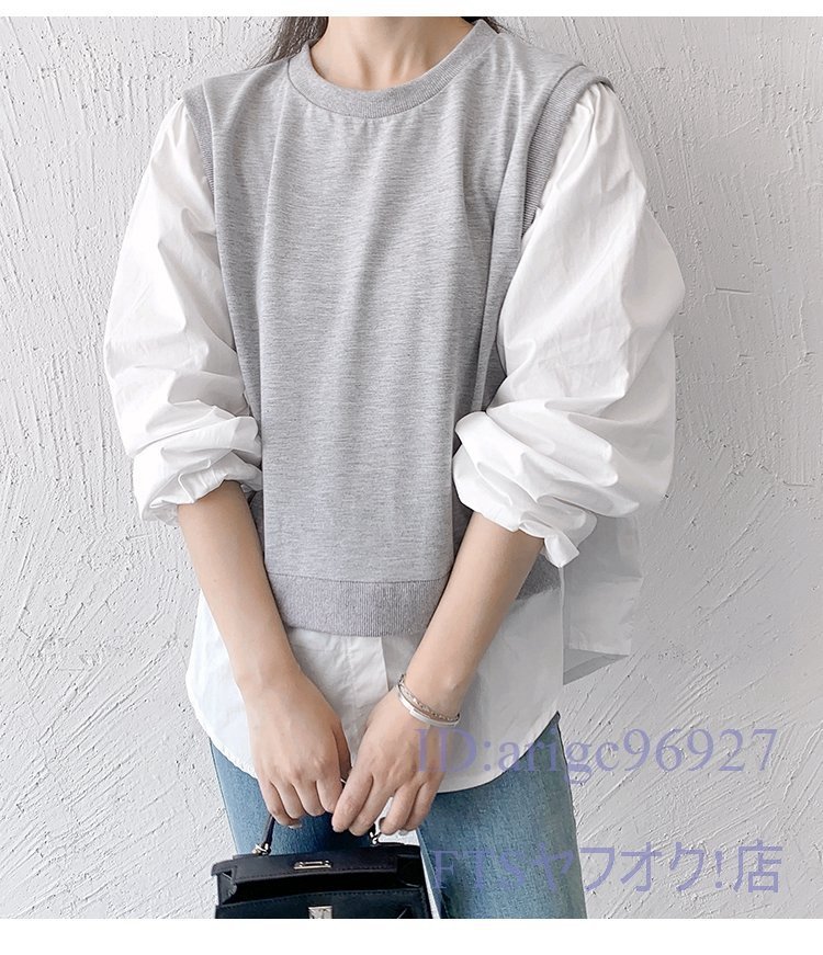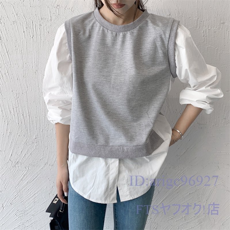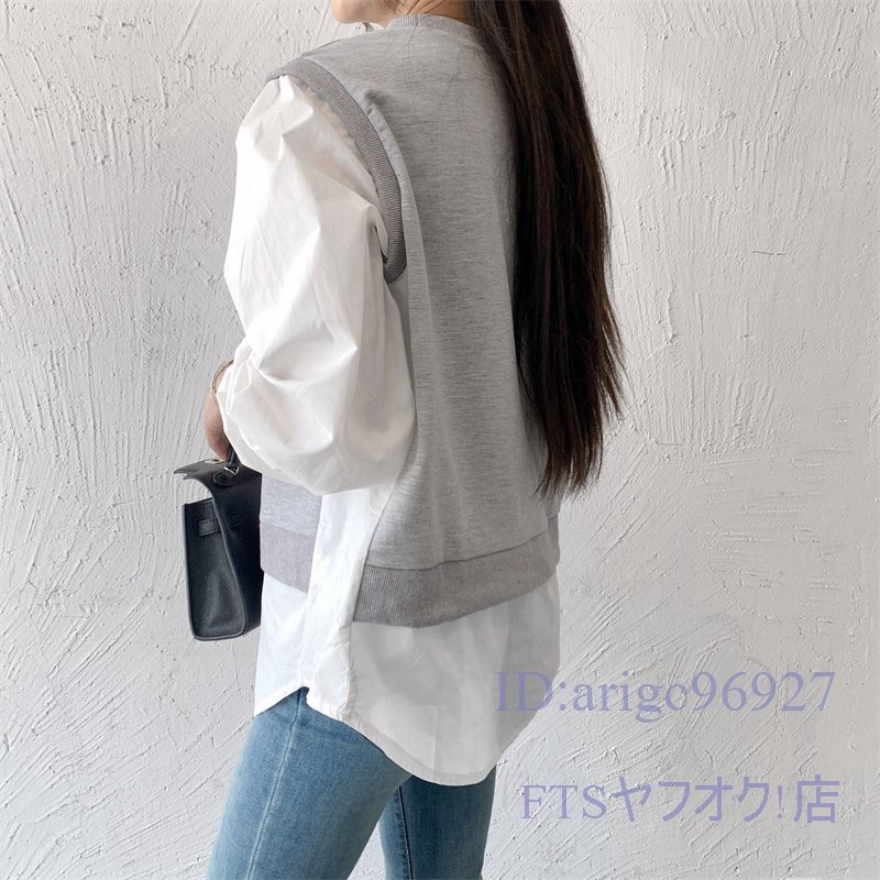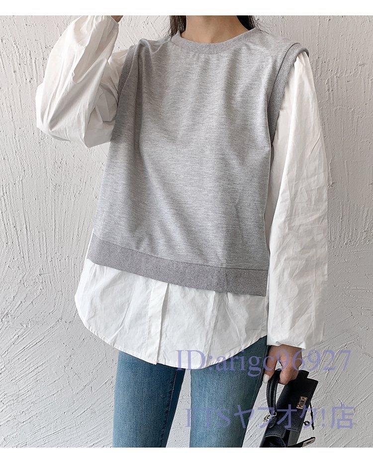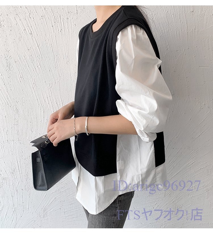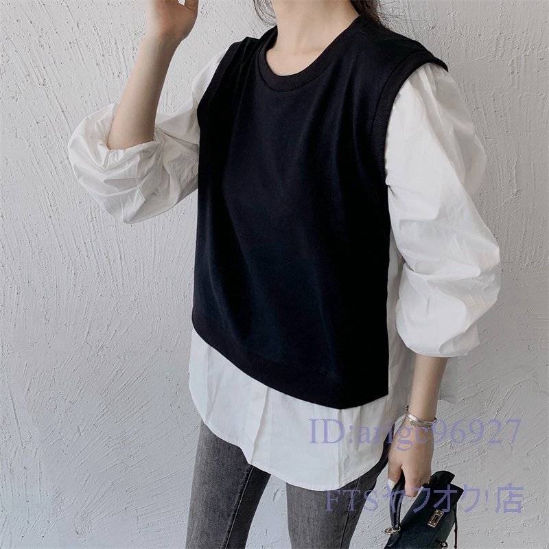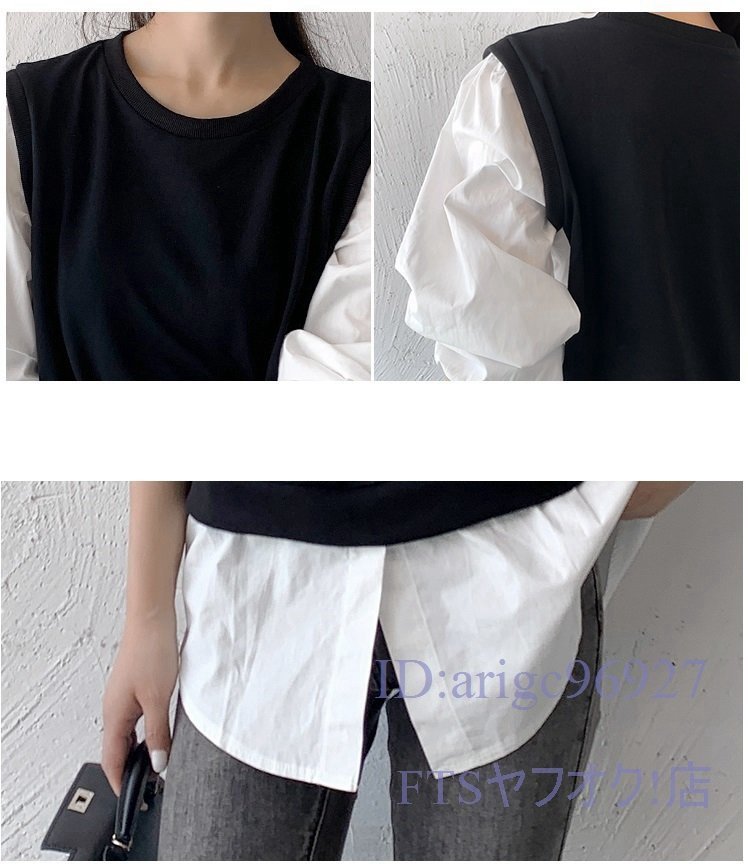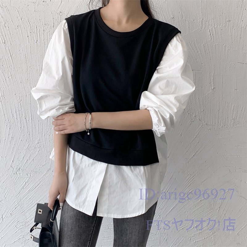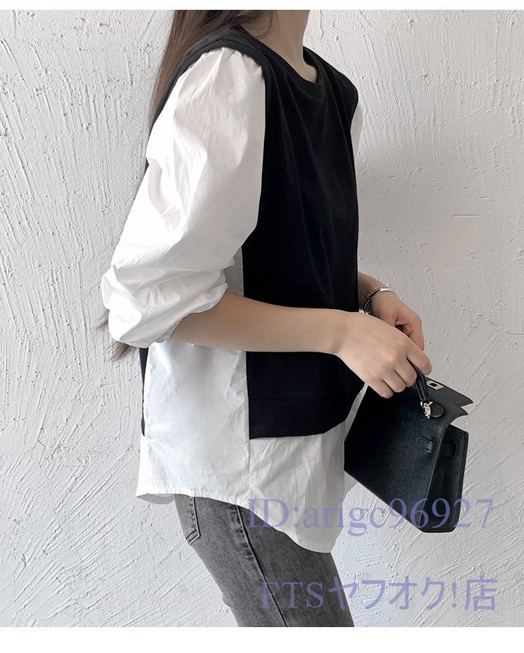 A2830☆新品カジュアル ナチュラル 重ね着風 ゆったり大きいサイズ 切り替え 配色 長袖シャツブラウス F 黒