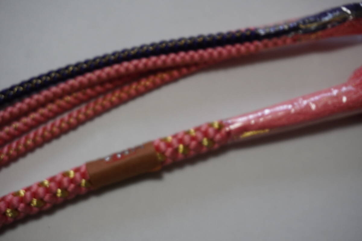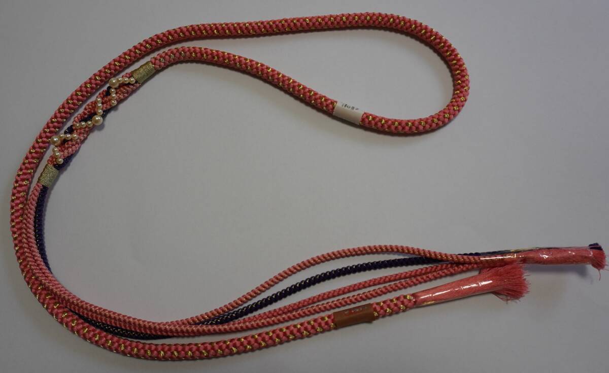 (特価)飾りつき丸帯締め 絹100%(含、金属糸使用) 飾りつき丸帯め。新品処分品。もも色系 金色糸の編みこみアリ)で途中から4本分かれ、飾り玉つき(モニターにより、濃く、または薄くっている場合などありますので心配なかたは質問をしてください)。 巾約10mm 。長さ房を入れないで約155cm(M寸表示)