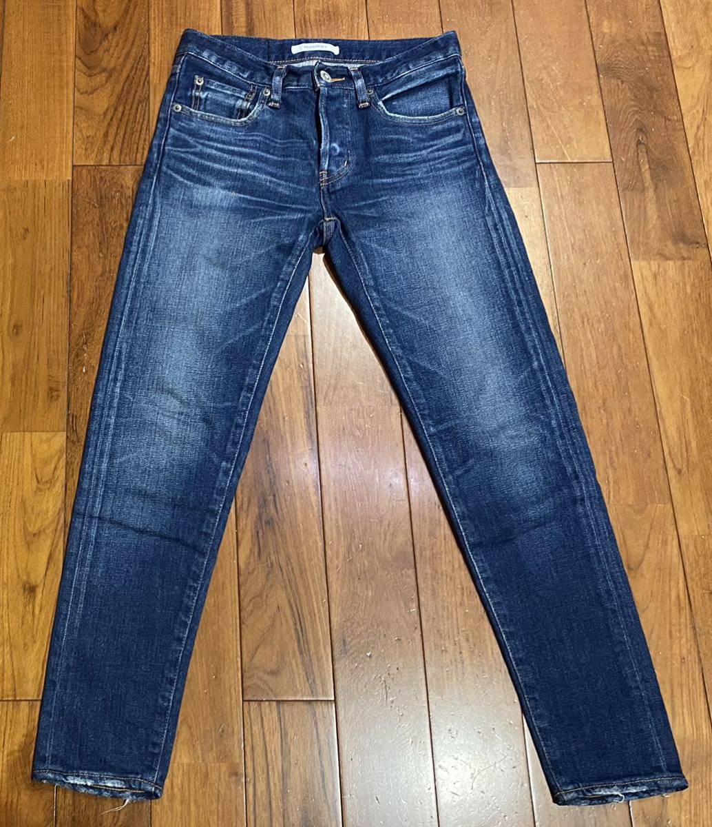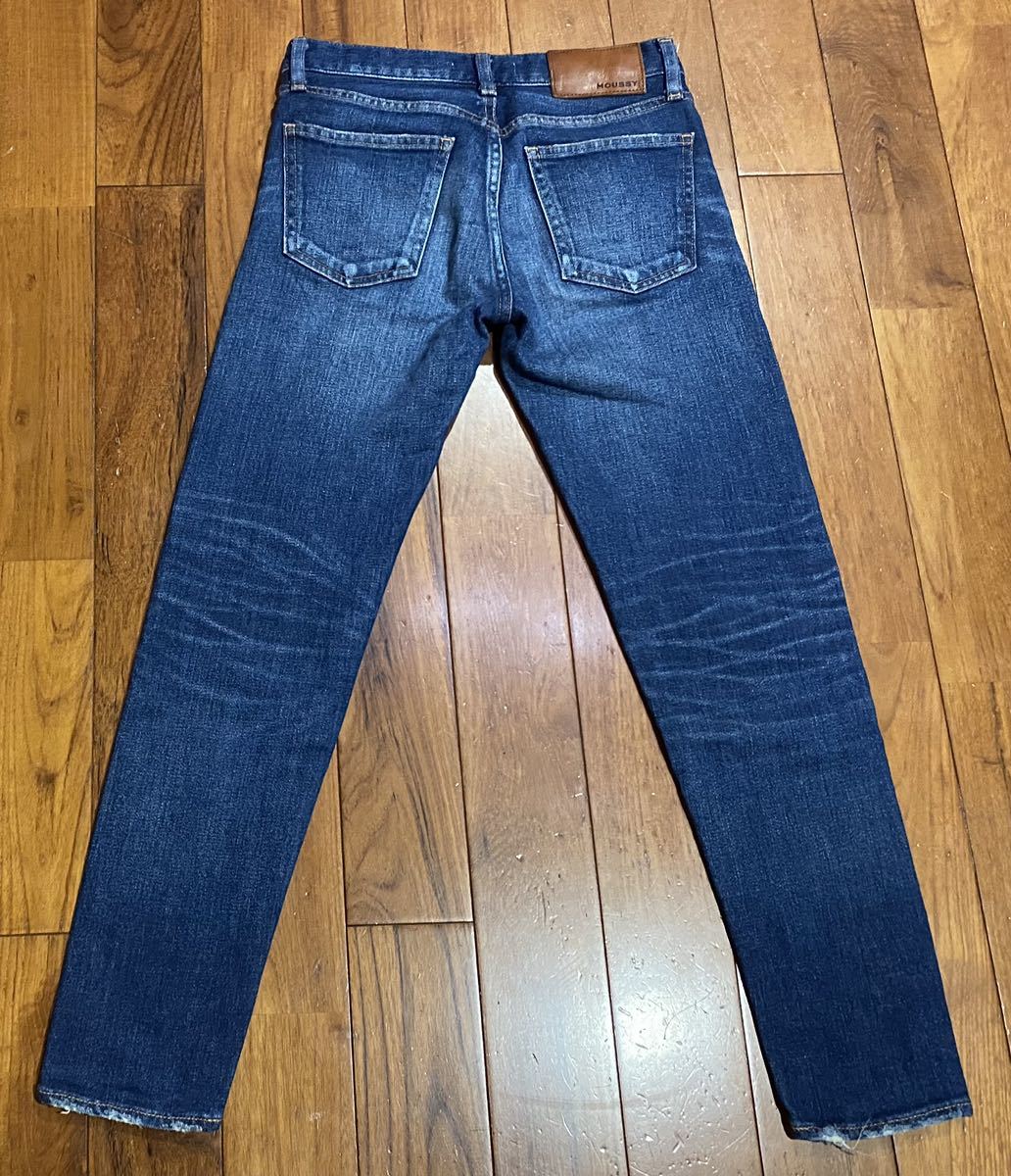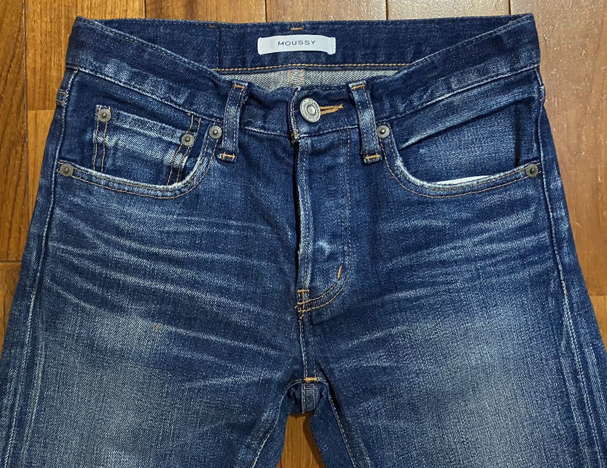 マウジーのストレッチアンクルスキニーデニム(ジーンズ)、品番0108AC12-6090です。色はインディゴブルーです。USEDですが状態は良いです(10段階中8程度)。牛革パッチ、ジッパーフライ、裾はチェーンステッチです。生地はストレッチ入りでコットン 94%、ポリエステル4%、ポリウレタン2%です。正規品です((株)バロックジャパンリミテッド、日本製)。サイズはW23でウエストは重ねずに平置きで約69cm、ヒップ約86cm、股上約21cm、股下約66cm、股下15cmのふともも部分約42cm、裾まわり約26cm、重量約420gです。発送はゆうパケットポストになります。