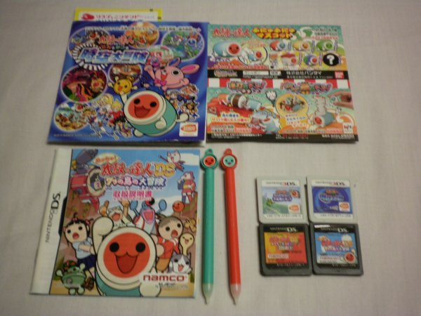中古【3DS+DS 太鼓の達人 ちびドラゴンと不思議なオーブ+どんとかつの時空大冒険+7つの島の大冒険+タッチでドコドン お買得4本セット(ソフトのみ+操作説明シート付+説明書付+おまけバチペン2本付)】