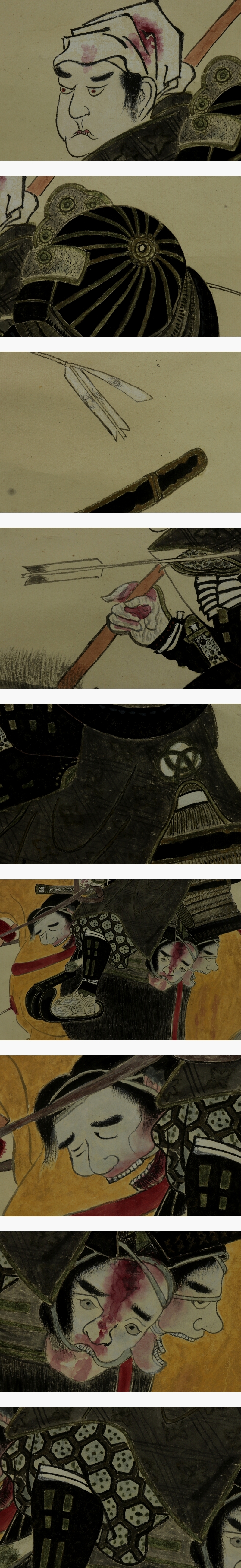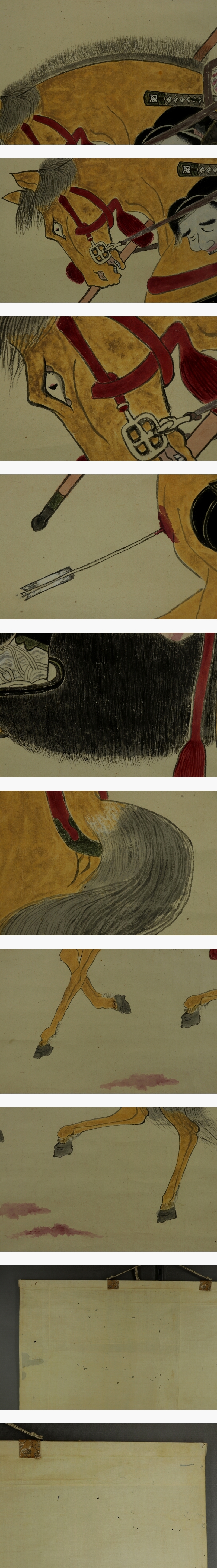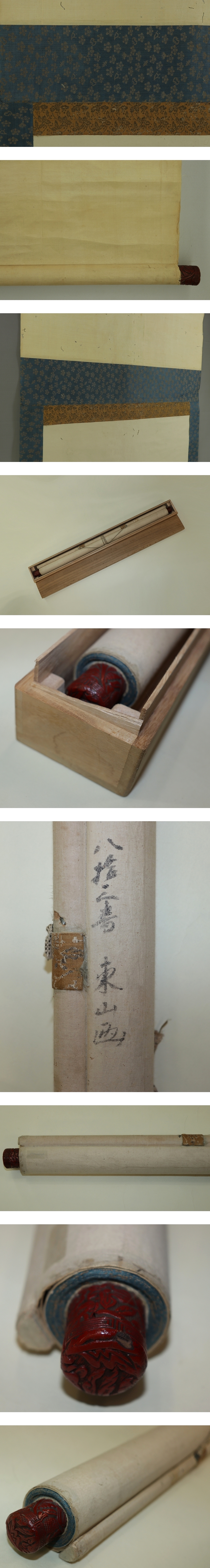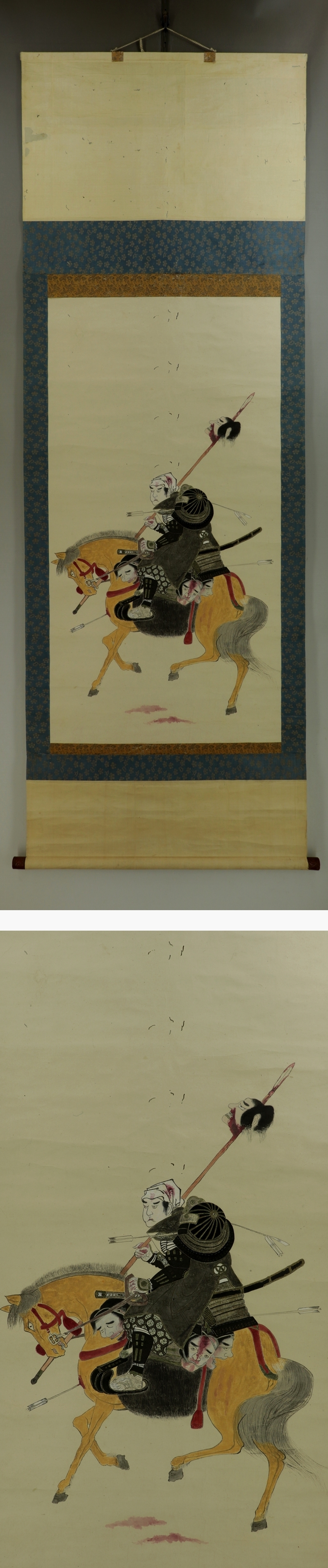 古画【前田犬千代之図】 本紙は、染み、汚れ、折れ、皺、虫食い、擦れがあります。 表装は、染み、汚れ、強い折れ、皺、虫食い、破れ、ほつれ、剥れ、修理痕、 軸先に傷、欠け、風帯に傷み、箱に割れがあります。 【サイズ】 作品 横約56cm×縦約108cm 表装 横約68cm×縦約197cm |