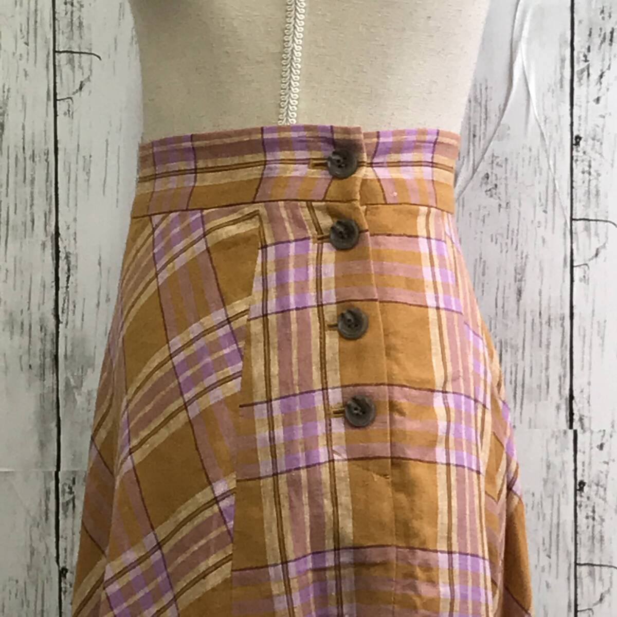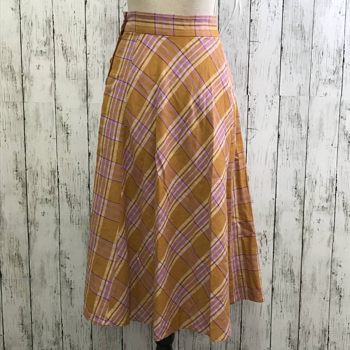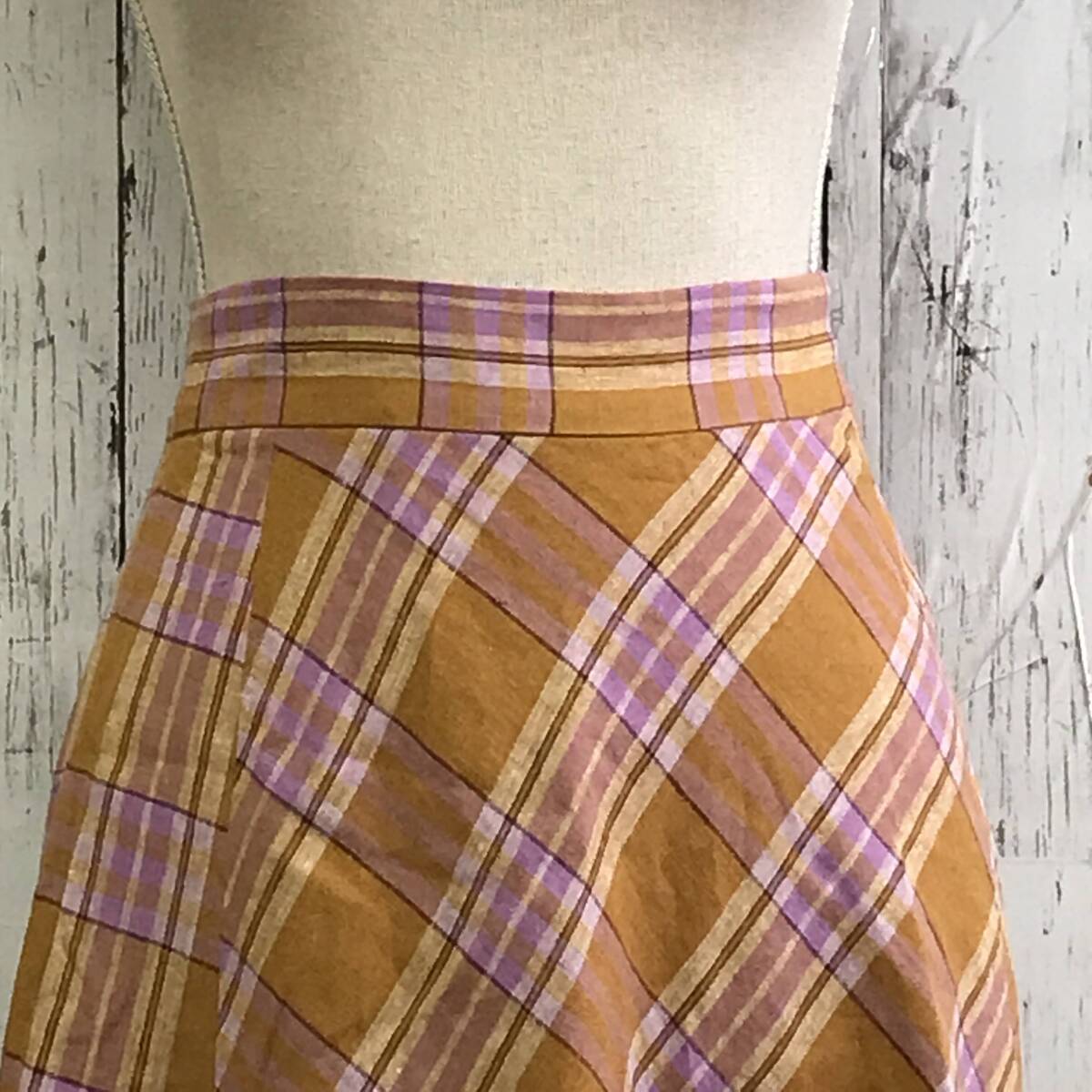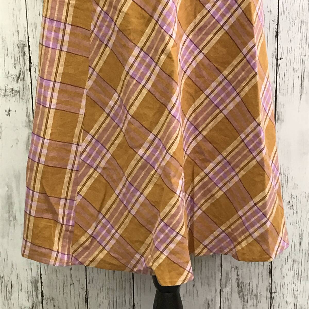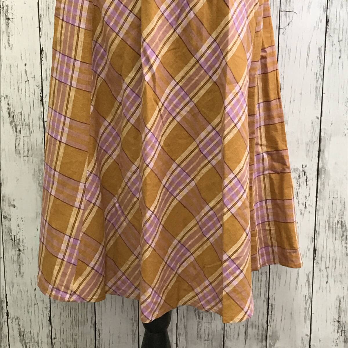 | 商品説明 | 商品名/チェックスカート サイズ/S 着丈76cmウエスト31cm 素材/表地・麻50%レーヨン50% 裏地・ポリエステル100% 商品状態/目立った傷、汚れ無し |