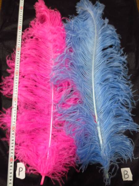 ビッグサイズのオストリッチ(駝鳥)の染羽です、サイズは羽の部分だけで60cm前後です。全部8色があります。お好きな色各1本を選び2本で1980円です。直輸入ゆえにこの格安さ!!!