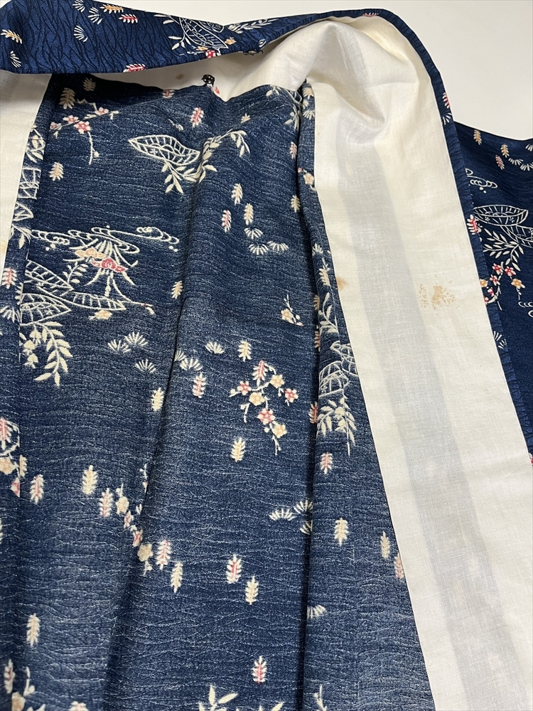 衿汚れ、袖汚れがあり、袖口布にも薄っすら黒ずみがありますが、柄が細かいのでそこまで目立たないかと思います。胴裏にもやや薄黄ばみ感があります。