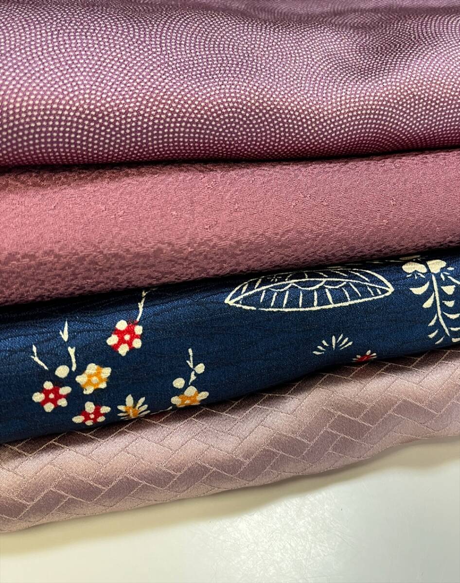 花とら●リサイクル着物 小紋 色無地 4枚まとめて 着用可能 鮫小紋 綸子 単衣 紅型風 ろうけつ染   240216