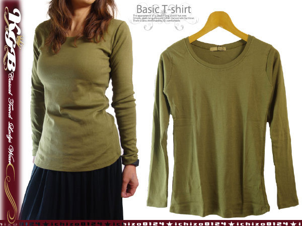 L カーキ 長袖Tシャツ ロンT カットソー レディース コットン 綿 定番 無地 ベーシック 新品